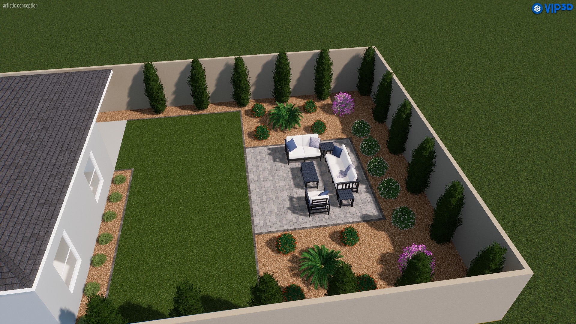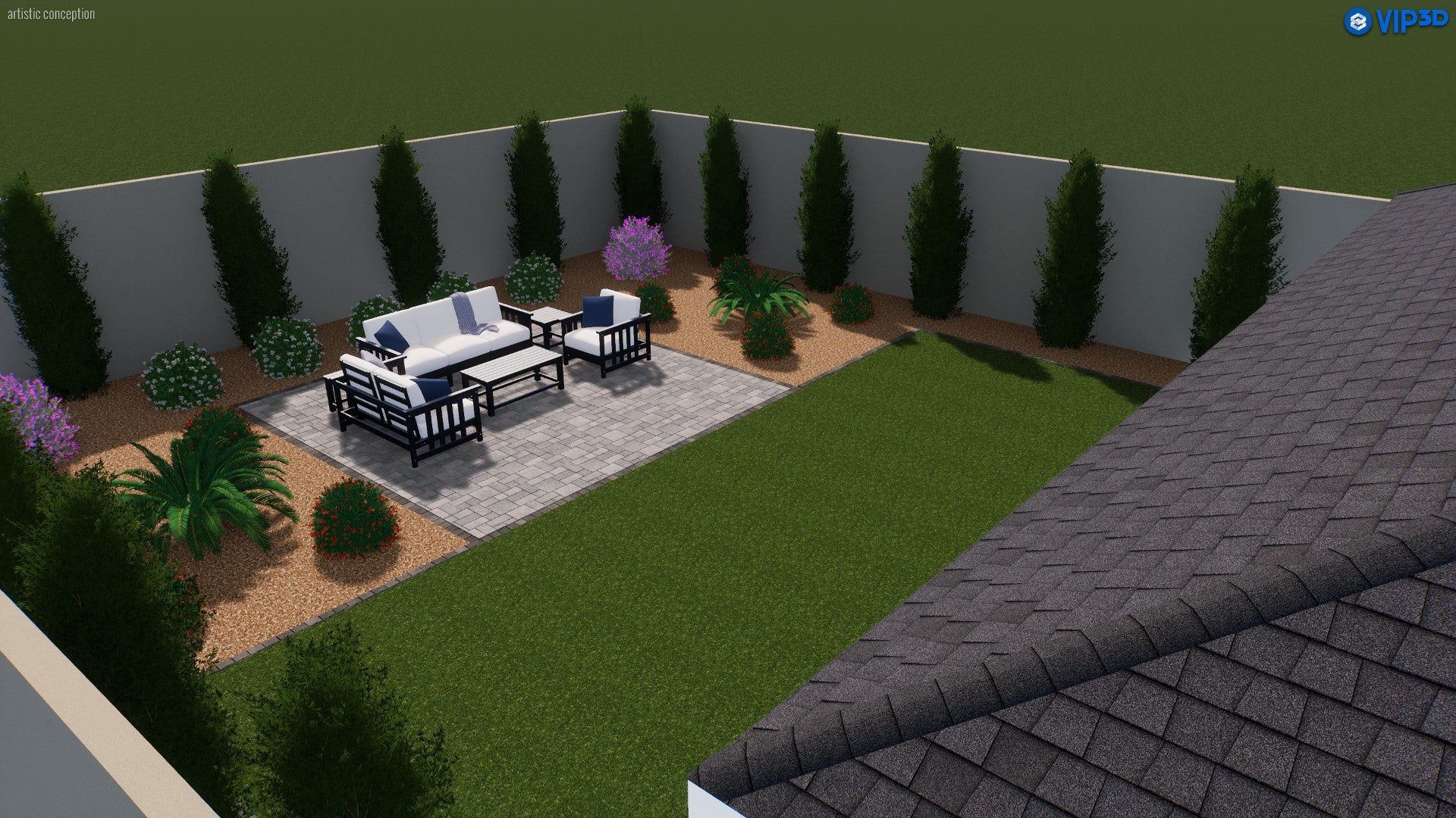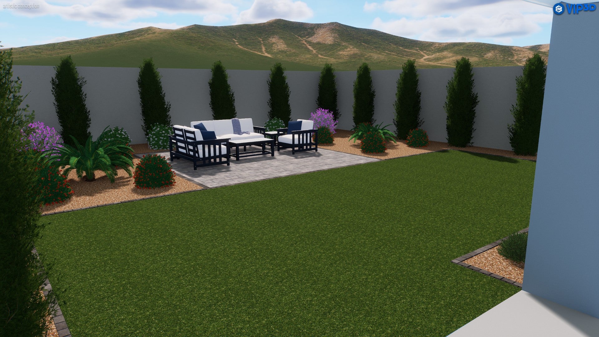 This backyard landscape design creates a private courtyard-style retreat ideal for homes throughout Phoenix, Scottsdale, Chandler, and the surrounding Arizona Valley. A clean paver patio anchors the space, providing a comfortable outdoor living area for relaxing and entertaining, while open turf keeps the yard feeling spacious and functional. Along the perimeter walls, tall evergreen privacy trees form a natural screen, enhancing seclusion and reducing noise while maintaining a polished, modern look. Drought-tolerant desert shrubs, flowering accents, and sculptural plants soften the hardscape and add year-round color with minimal water use. Decorative rock ground cover helps retain moisture, control weeds, and reduce long-term maintenance. This design is perfect for homeowners seeking a balanced Phoenix backyard landscape that combines usable lawn space, outdoor seating, privacy, and desert-friendly plantings built for the local climate.