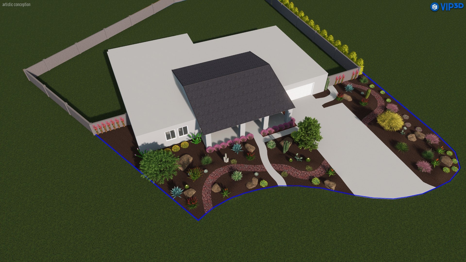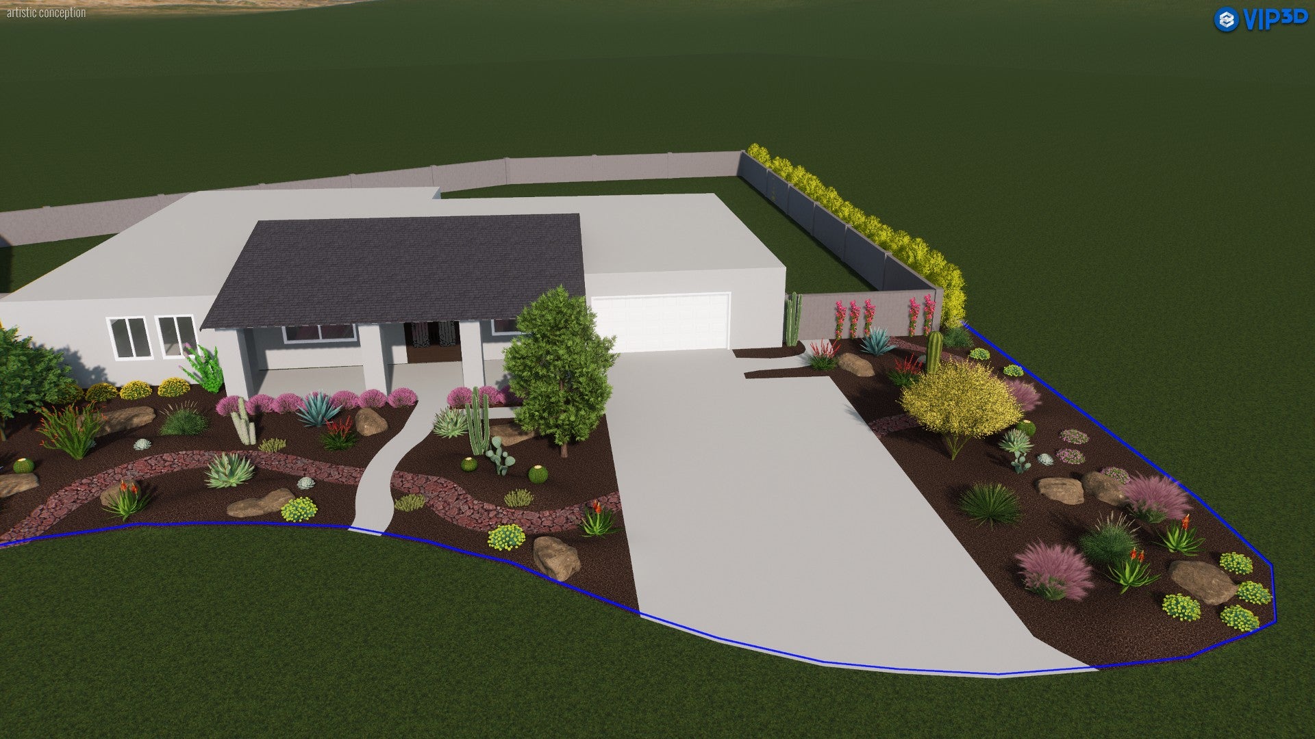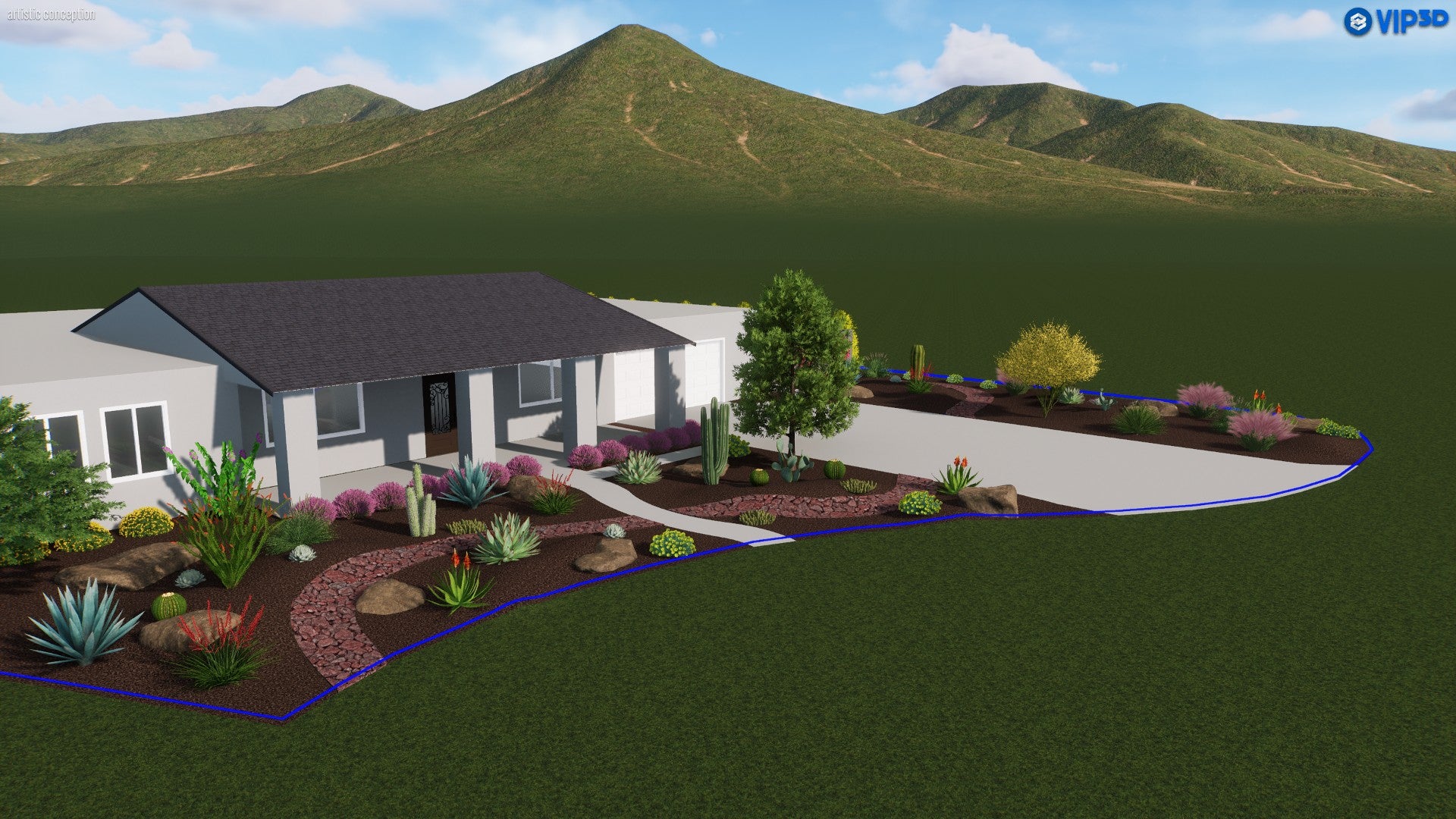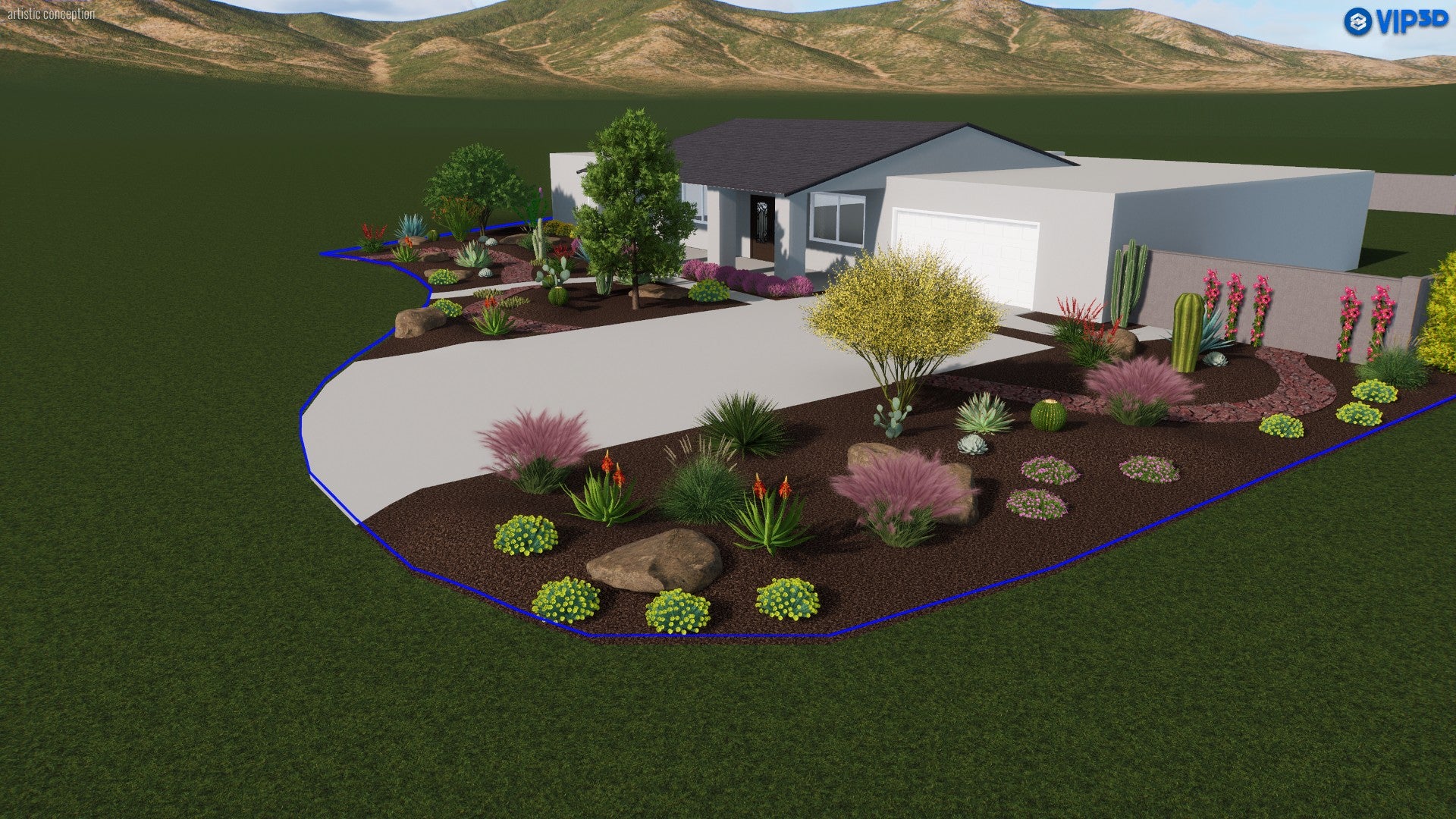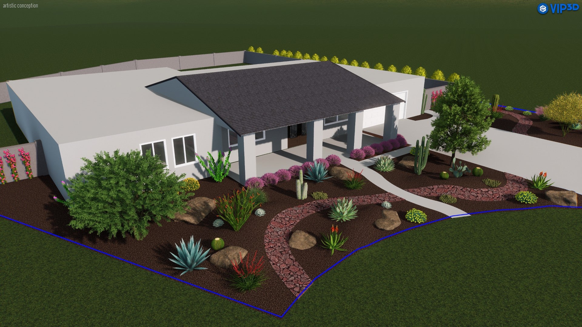 This front yard design blends the natural drama of the Southwest with modern curb appeal. A warm-toned mulch backdrop highlights clusters of cacti and succulents, balanced by feathery ornamental grasses that add both texture and movement. Pops of vibrant blooms appear in beds around the driveway, while a graceful palo verde provides filtered shade near the home’s entrance. Subtle, meandering pathways guide guests through the garden, revealing colorful surprises like blooming shrubs and climbing vines along the walls. The overall effect is a dynamic, drought-friendly landscape that captures the essence of desert living in a thoroughly welcoming display.