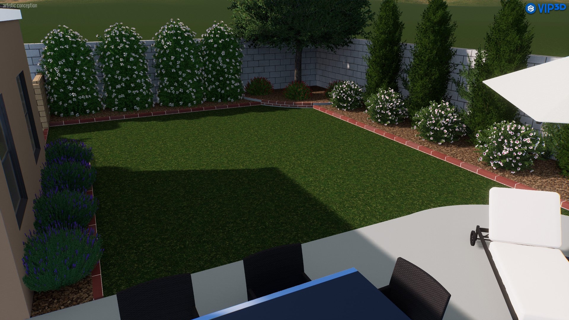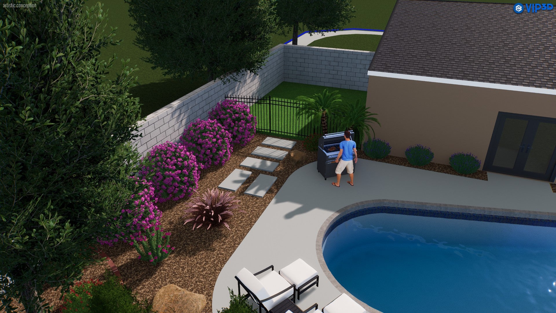 This front yard design blends the natural drama of the Southwest with modern curb appeal. A warm-toned mulch backdrop highlights clusters of cacti and succulents, balanced by feathery ornamental grasses that add both texture and movement. Pops of vibrant blooms appear in beds around the driveway, while a graceful palo verde provides filtered shade near the home’s entrance. Subtle, meandering pathways guide guests through the garden, revealing colorful surprises like blooming shrubs and climbing vines along the walls. The overall effect is a dynamic, drought-friendly landscape that captures the essence of desert living in a thoroughly welcoming display.