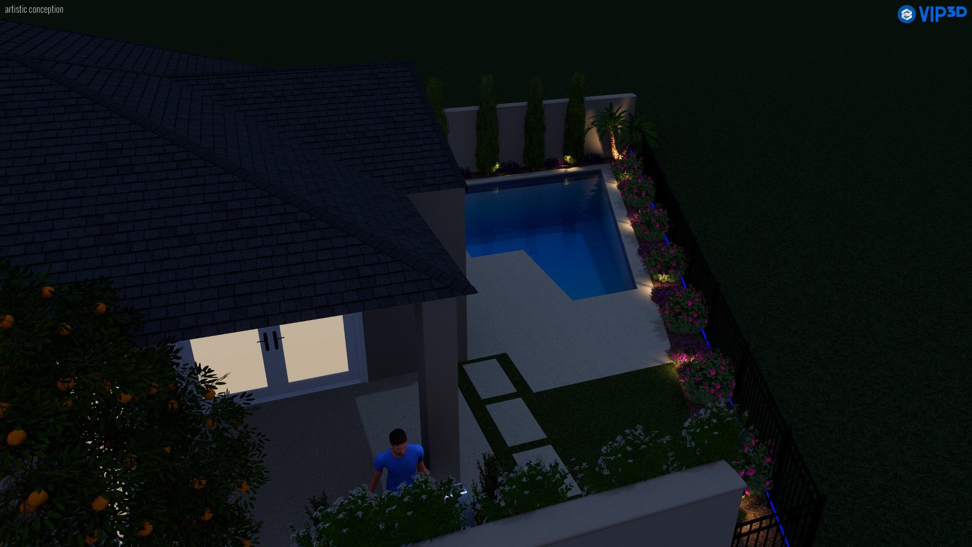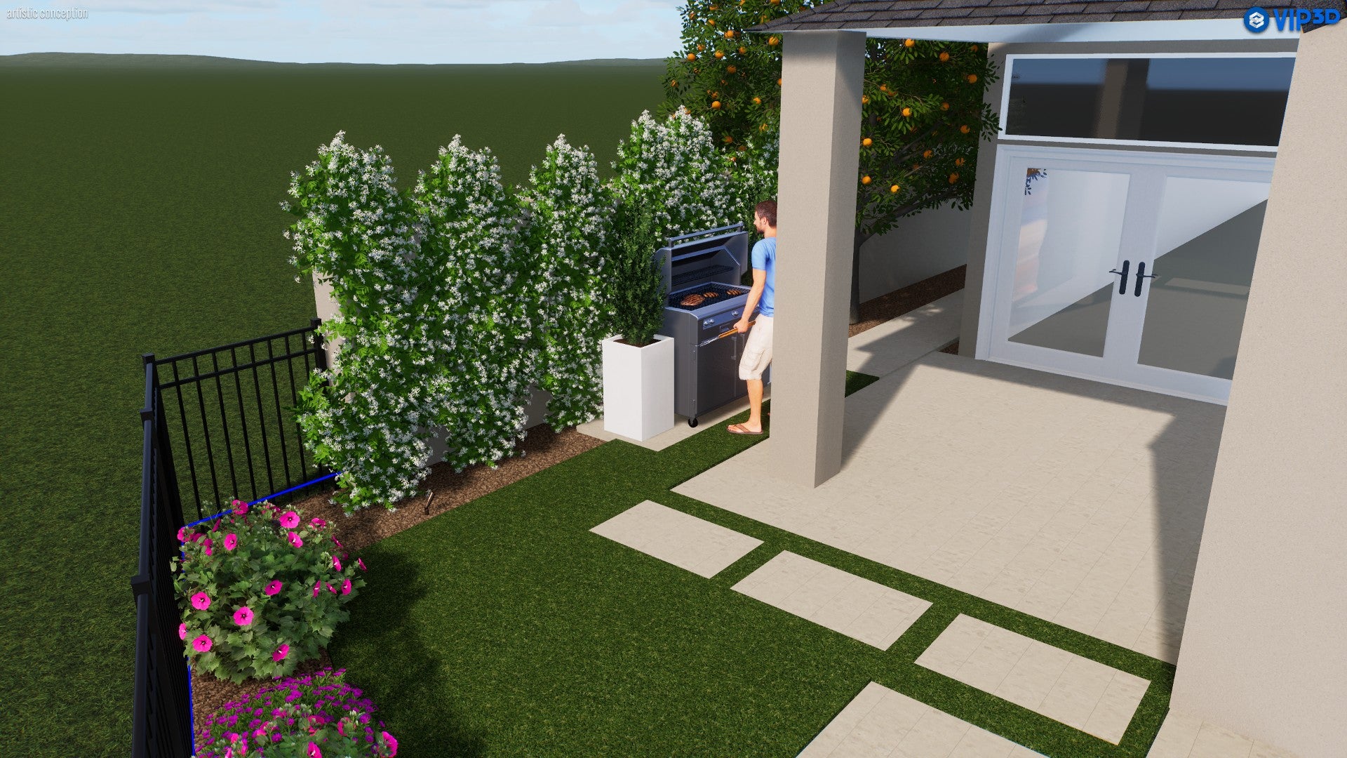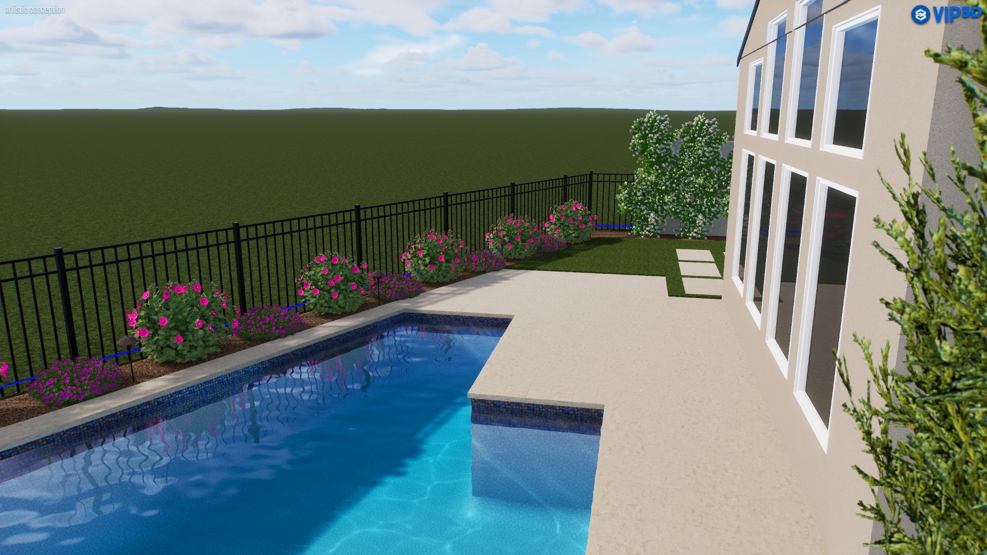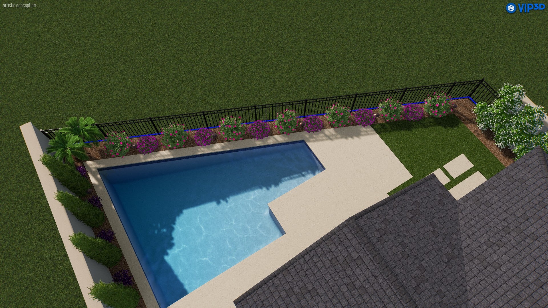 This poolside landscape design creates a sleek, private outdoor retreat ideal for homes throughout Phoenix, Scottsdale, Gilbert, and the surrounding Arizona Valley. Clean concrete pool decking provides a crisp, modern foundation, while layered planting beds soften the space with color, texture, and privacy. Tall evergreen privacy trees line the perimeter wall, forming a natural screen that enhances seclusion without blocking airflow or light. Flowering shrubs and groundcover add seasonal color along the pool fence, creating visual interest day and night, especially when paired with subtle landscape lighting. Turf walkways and stepping stones connect functional zones while keeping the layout simple and easy to maintain. Designed with desert-friendly plants and efficient spacing, this poolside landscape is perfect for homeowners seeking a low-water, low-maintenance pool environment that feels polished, private, and built for the Phoenix climate.