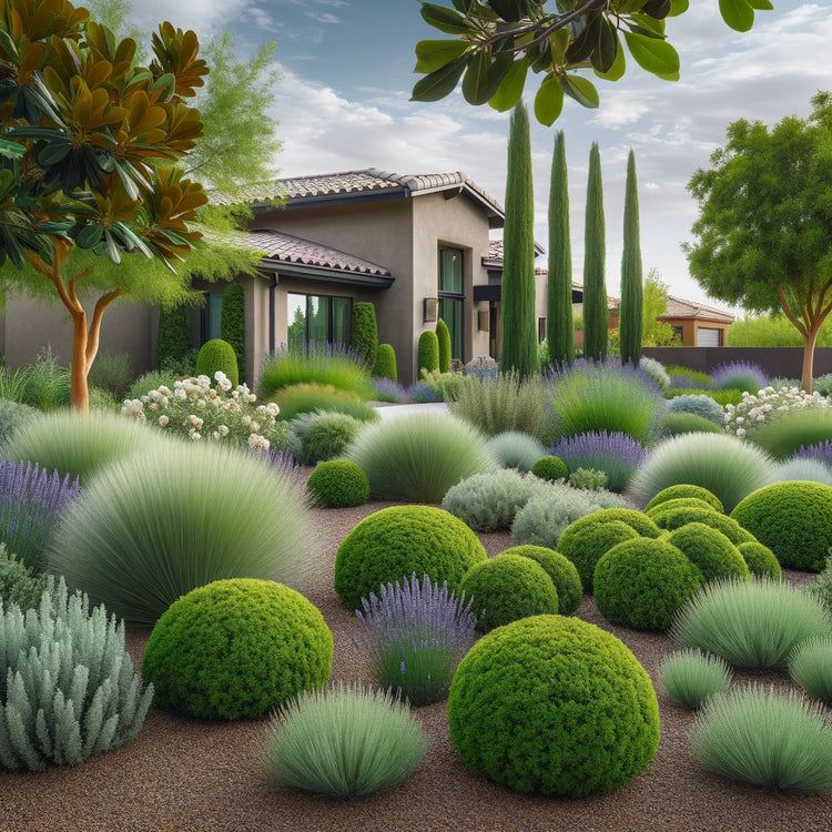 Upon returning home, you're immediately struck by the sleek, modern landscape that unfolds before you in the Arizona desert. Clean lines and minimalist design principles dictate the outdoor space, with geometric patterns and structured plantings providing a stark contrast to the wild desert backdrop. Strategic use of native succulents and drought-tolerant plants ensures sustainability, while steel, glass, and concrete elements integrate seamlessly, reflecting the simplicity and elegance of modern architecture. Accent lighting highlights the garden's features, creating an inviting ambiance that extends the living space outdoors, offering a serene, contemporary retreat under the vast Arizona sky.