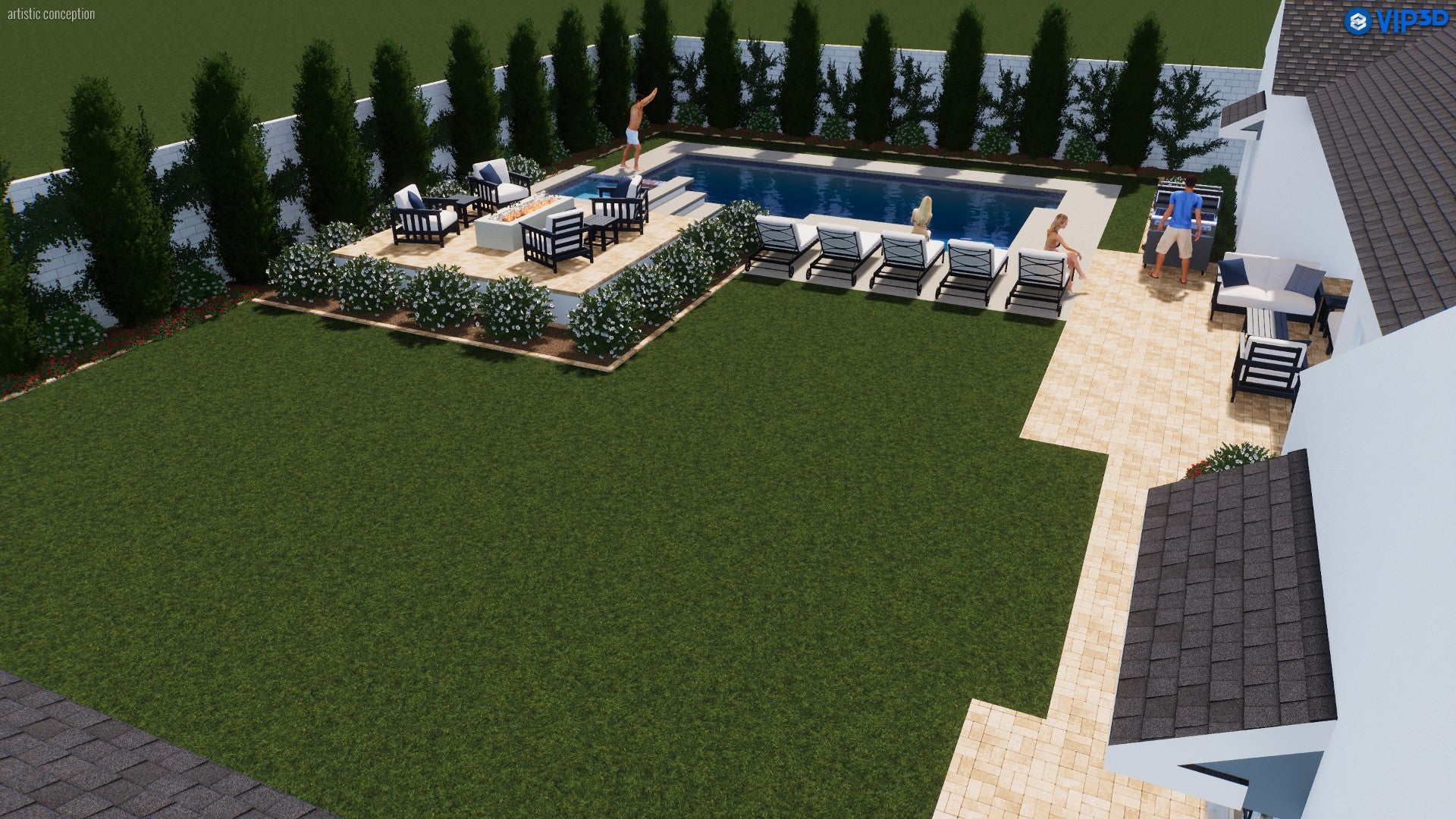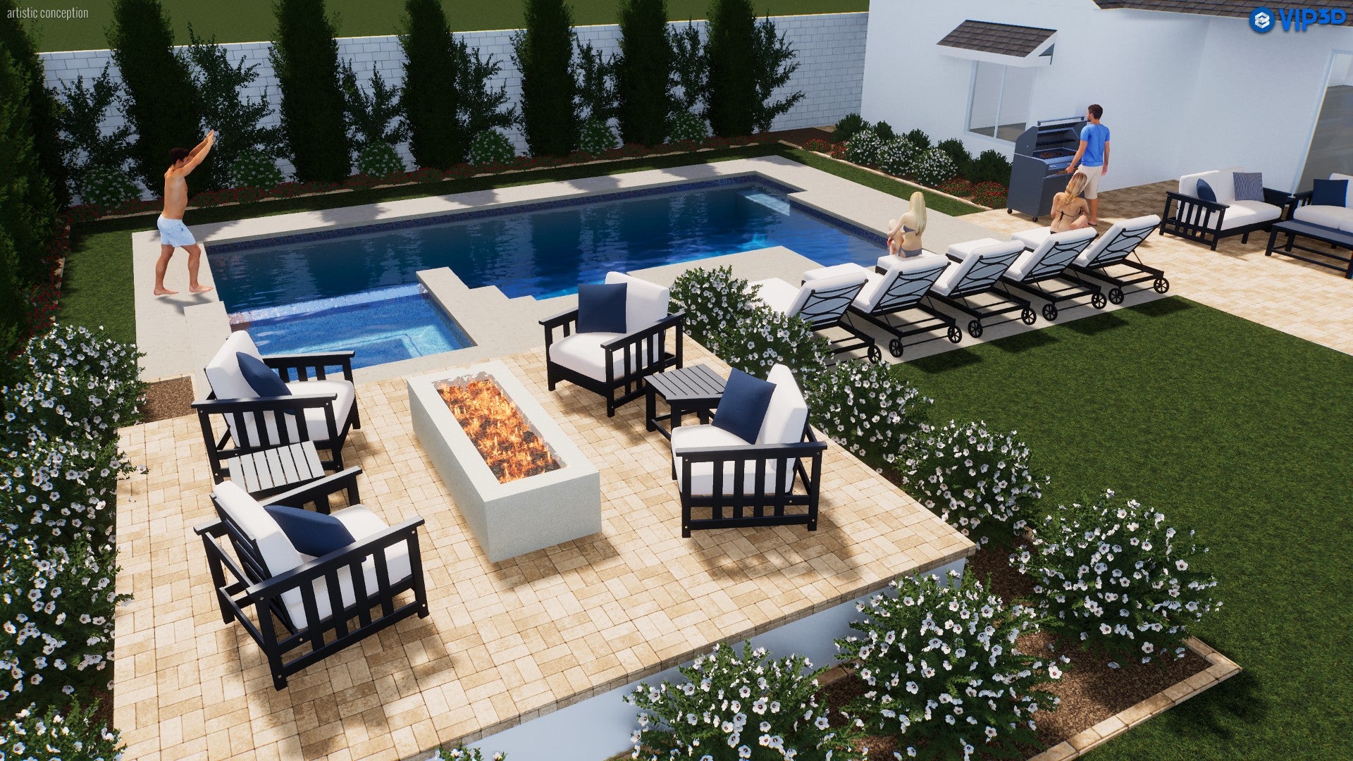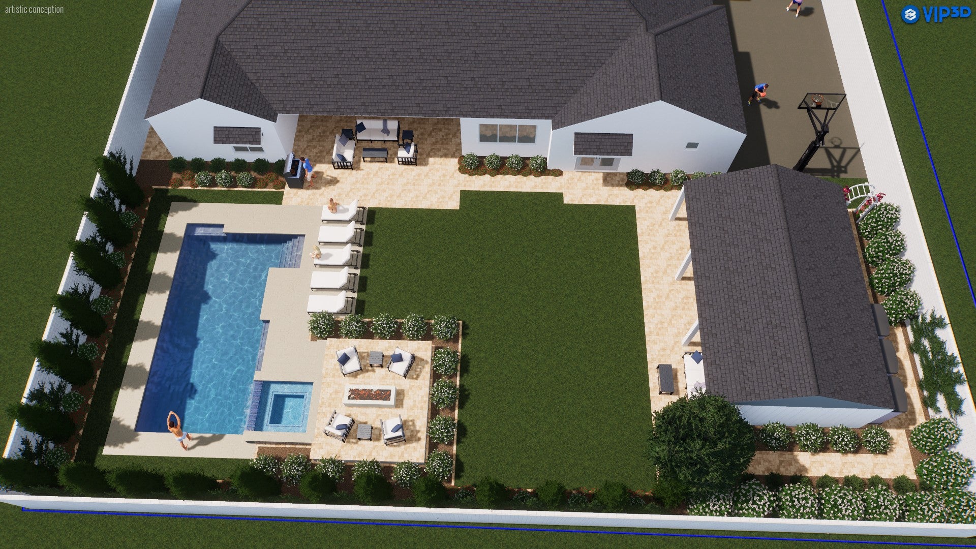 This sleek backyard design centers around a spacious pool and spa, anchored by clean lines and a bright, contemporary palette. A lush, expansive lawn offsets the minimalist hardscape, while neatly trimmed hedges and subtle flower beds line the perimeter. A warm-toned patio seamlessly connects to the home, offering generous spaces for lounging, grilling, and dining under the sun. A cozy fire pit area provides a perfect gathering spot for breezy evenings. Overall, the layout strikes a harmonious balance between simplicity and comfort, creating a refreshing outdoor escape.