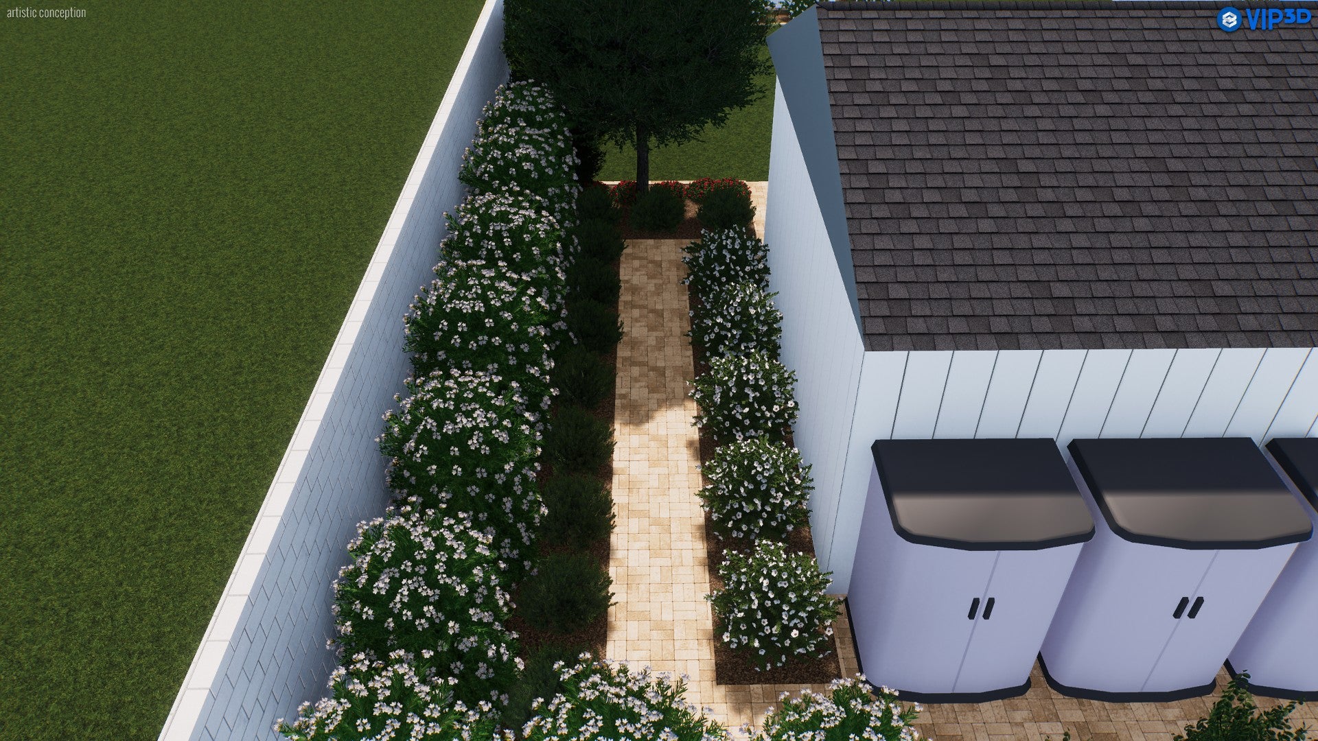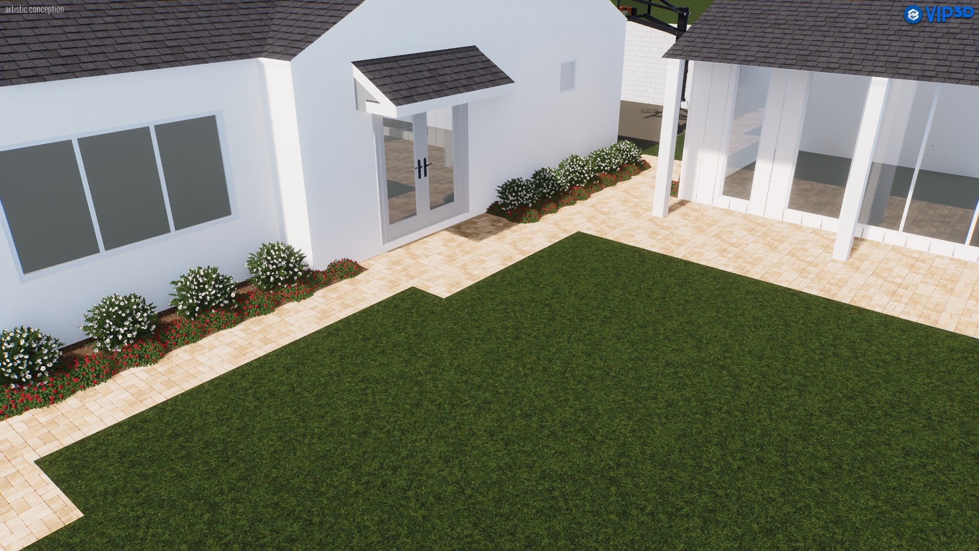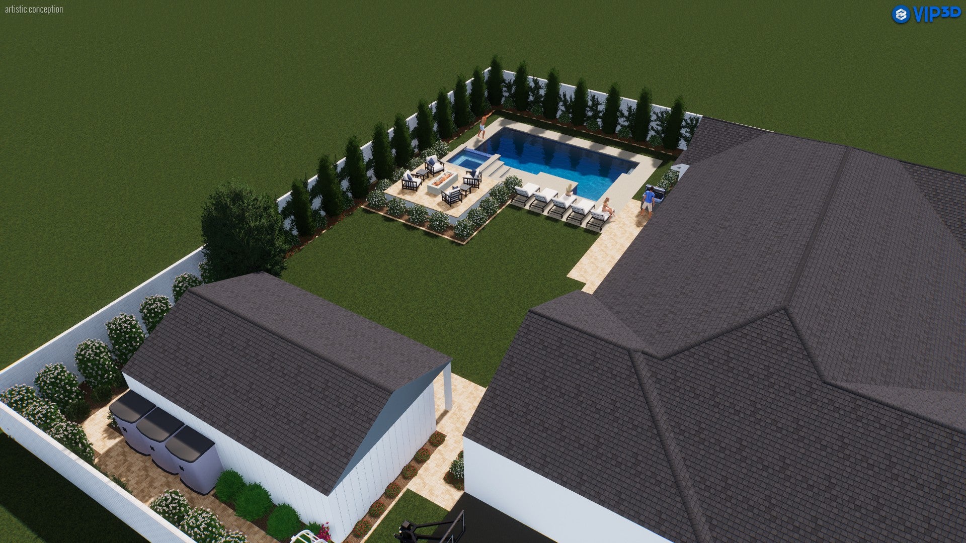 This sleek backyard design centers around a spacious pool and spa, anchored by clean lines and a bright, contemporary palette. A lush, expansive lawn offsets the minimalist hardscape, while neatly trimmed hedges and subtle flower beds line the perimeter. A warm-toned patio seamlessly connects to the home, offering generous spaces for lounging, grilling, and dining under the sun. A cozy fire pit area provides a perfect gathering spot for breezy evenings. Overall, the layout strikes a harmonious balance between simplicity and comfort, creating a refreshing outdoor escape.