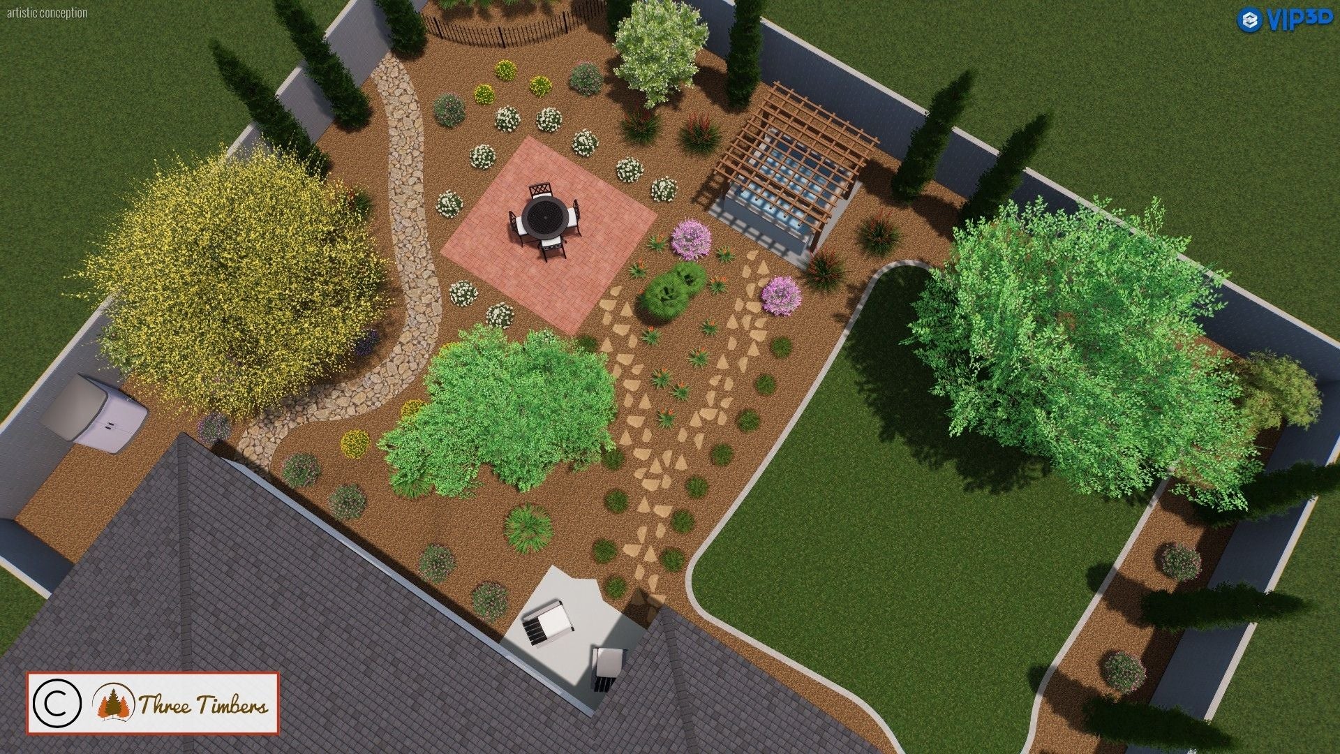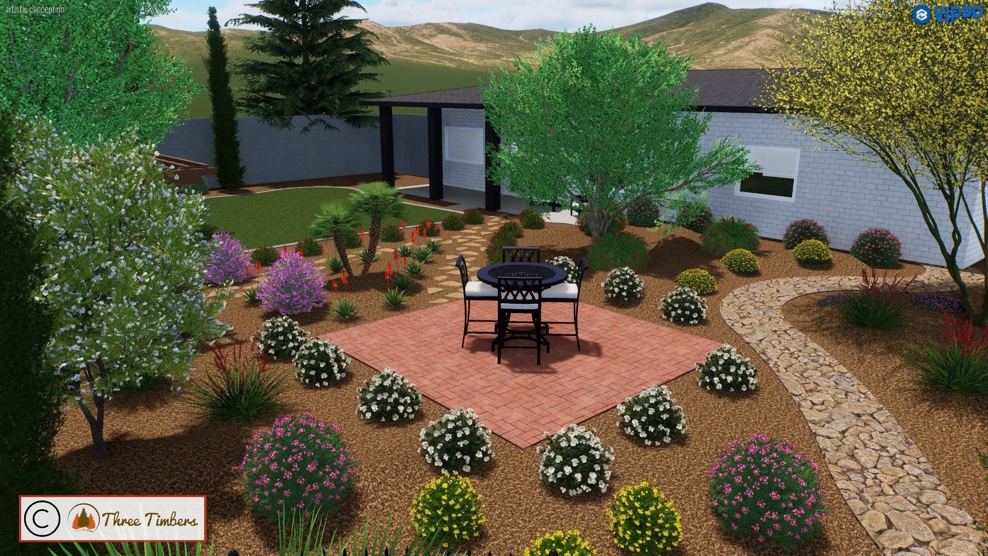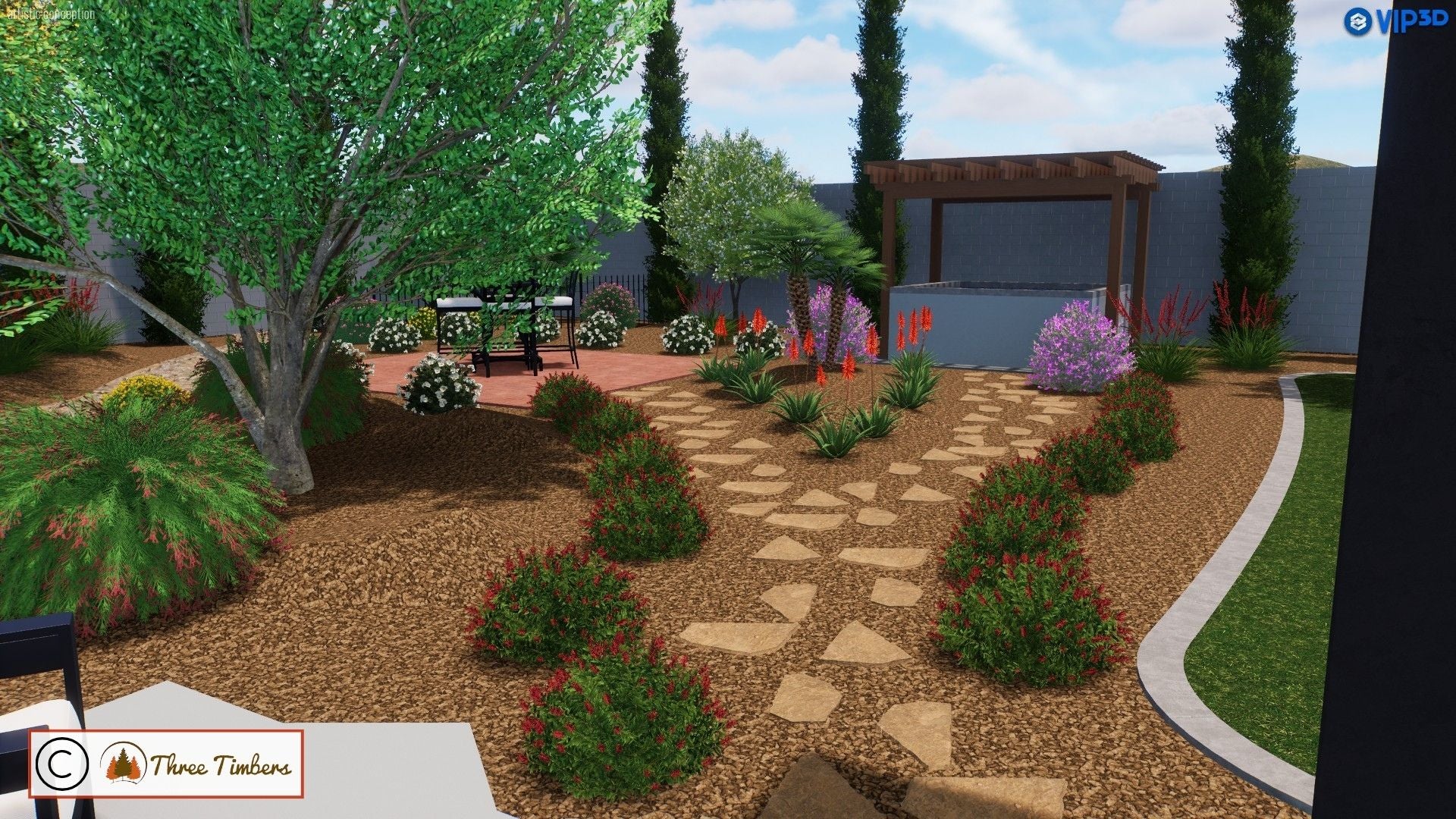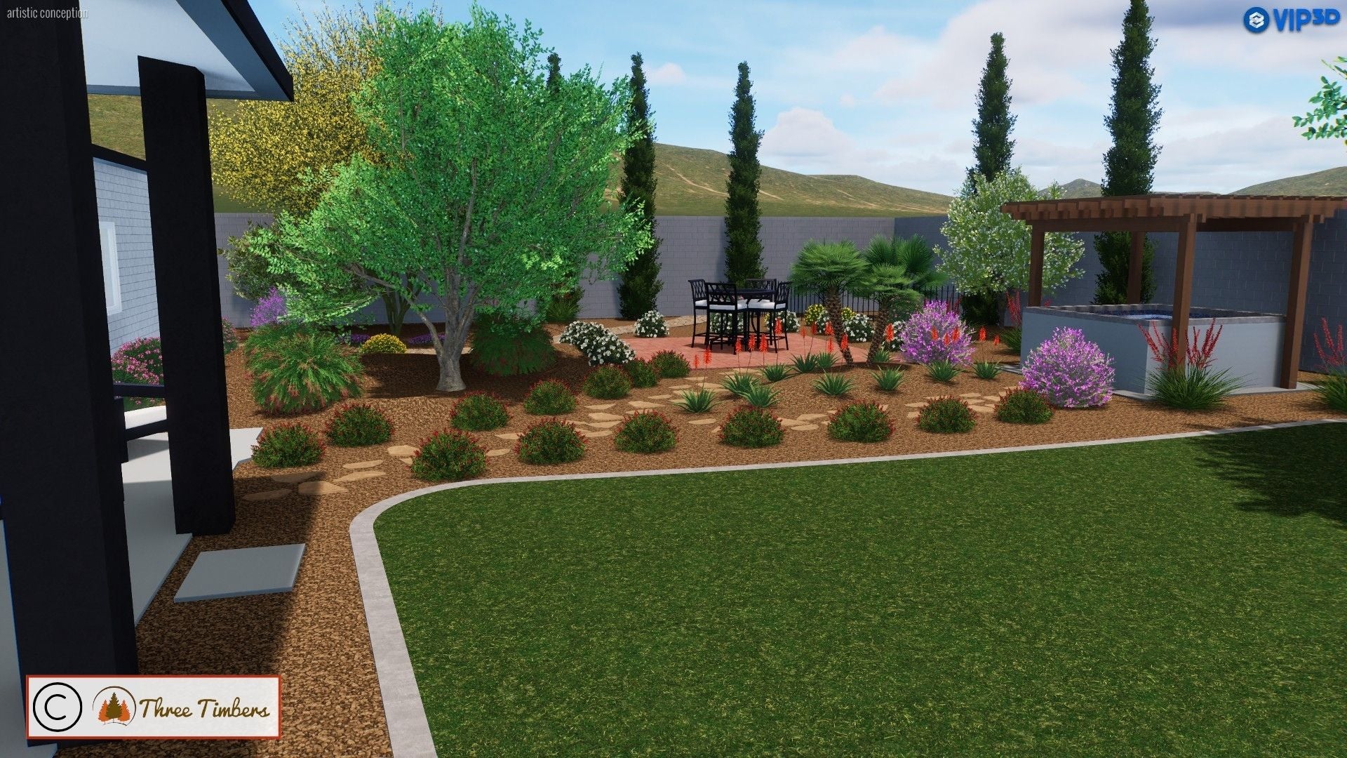 This inviting outdoor space brings together several distinct areas, creating a versatile haven for relaxation and entertainment. A brick-paved patio anchors a cozy dining set, surrounded by a colorful array of waterwise shrubs and perennials. Nearby, a graceful stone path meanders toward a spa sheltered by a warm-toned pergola, offering a perfect spot to unwind. Mature shade trees and pops of desert blooms lend vibrancy and texture, while a gently curving lawn provides an open space for play. Thoughtfully layered plants, stones, and seating nooks make this design both visually captivating and beautifully functional.