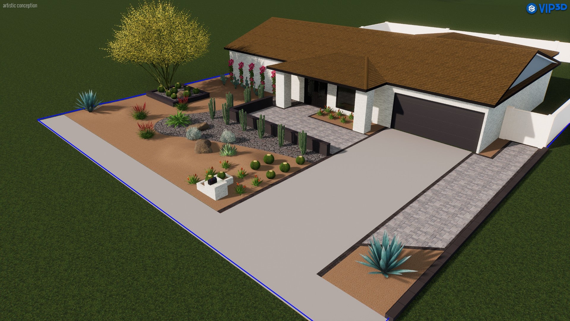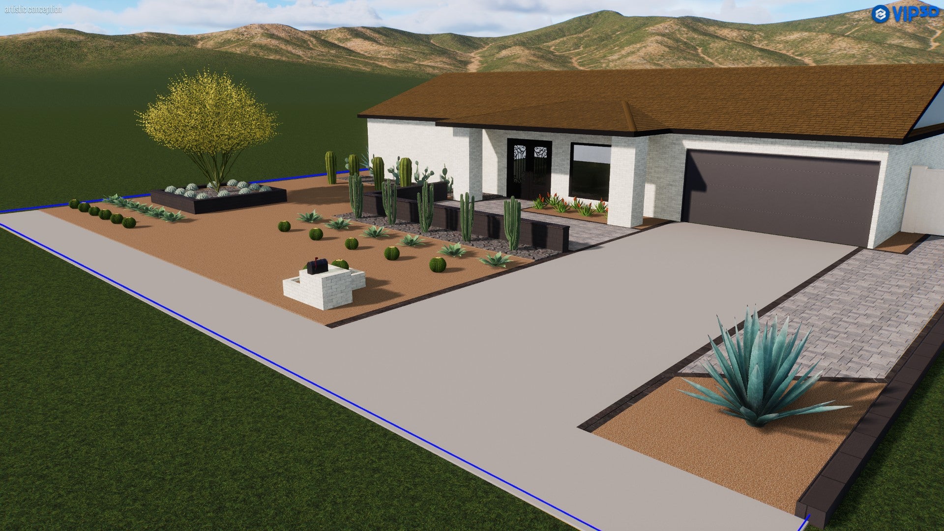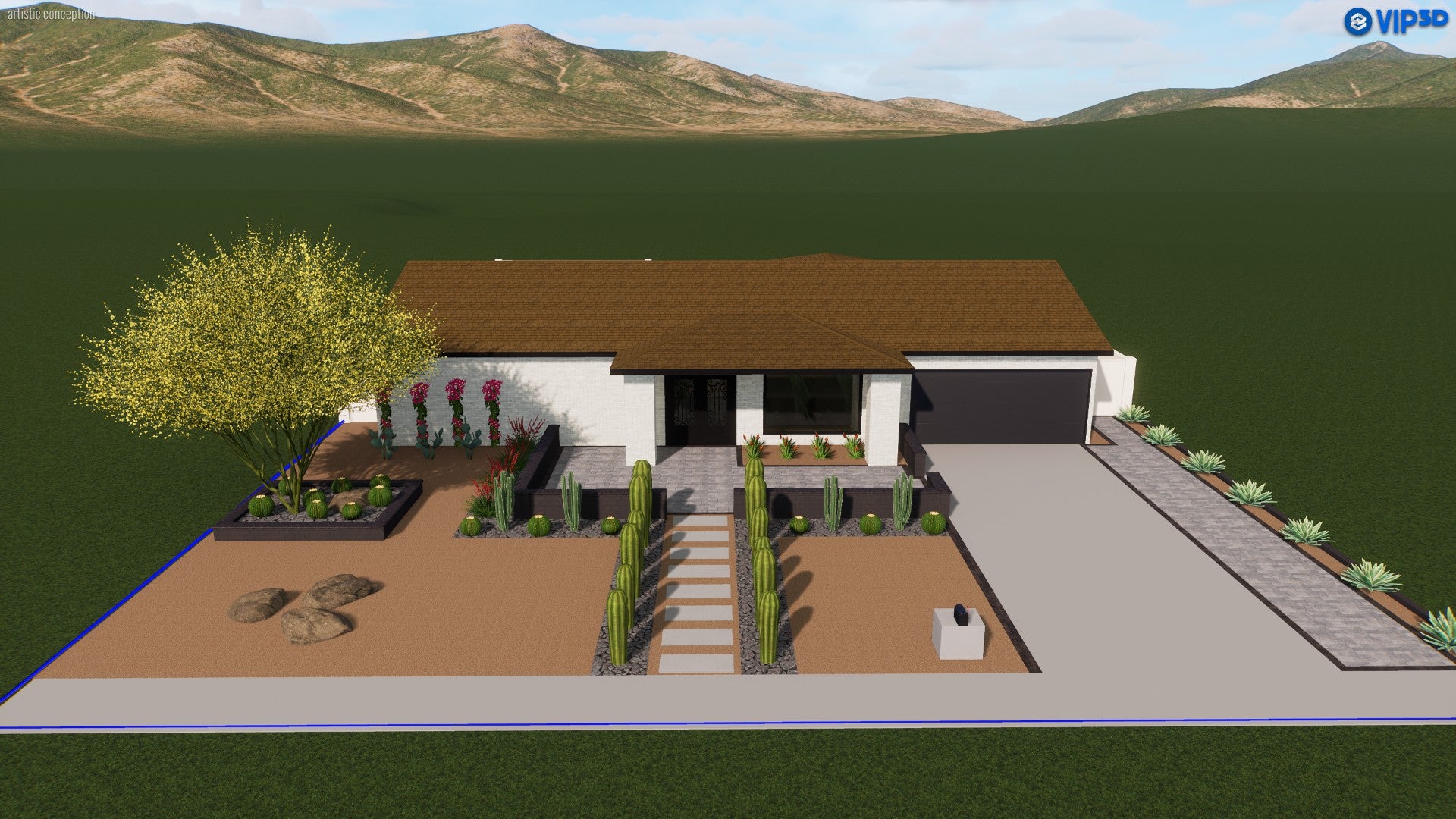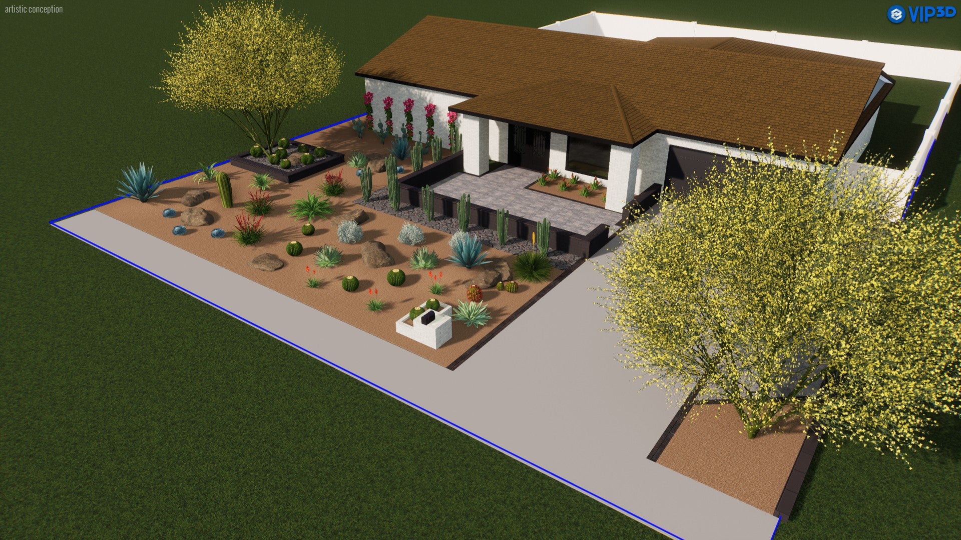 This eye-catching front yard pairs crisp architectural lines with warm desert elements to create a striking yet low-maintenance design. A golden-blooming palo verde tree anchors one corner, while carefully placed cacti and succulents dot the gravel beds in visually appealing clusters. Contrasting layers of black lava rock and neutral pavers lead to the entrance, echoing the home’s contemporary style. Pops of color from flowering plants and climbing vines break up the earthy tones, blending functional waterwise choices with a bold, sophisticated aesthetic.