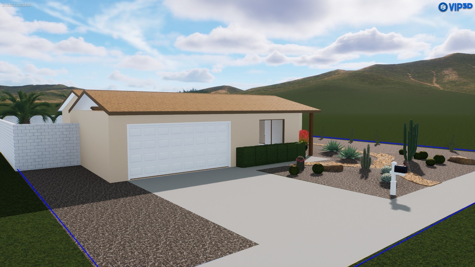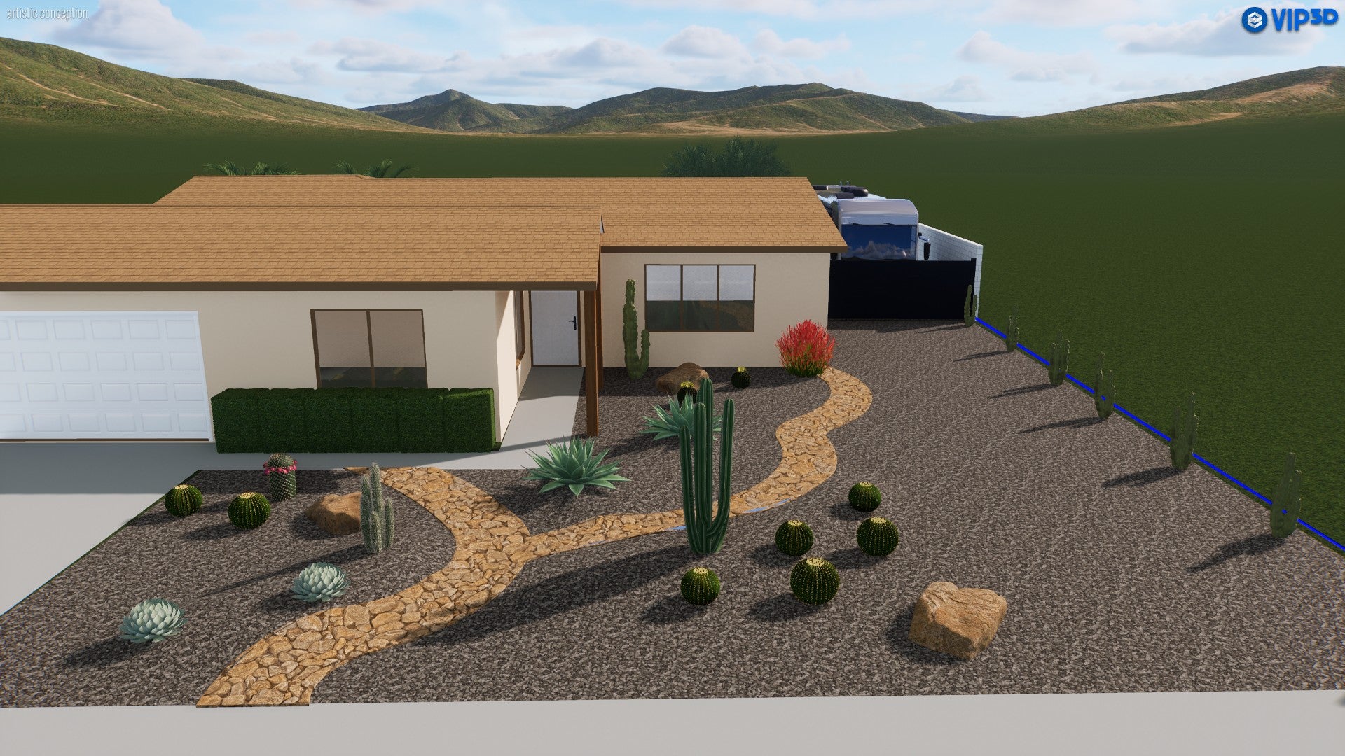 This clean, desert-inspired landscape design captures the essence of minimalism and natural beauty. A winding pathway of warm, golden stone meanders through gravel beds, creating visual interest without overwhelming the space. Low-maintenance cacti and succulents provide sculptural focal points while adding vibrant pops of green and red. The home’s simple architecture is complemented by subtle touches, such as a sleek hedge and a reserved palette of native plants. Overall, it’s a functional and inviting front yard that celebrates the arid surroundings with effortless style. FIND THE FULL DESIGN AT THE BOTTOM OF THE PAGE!