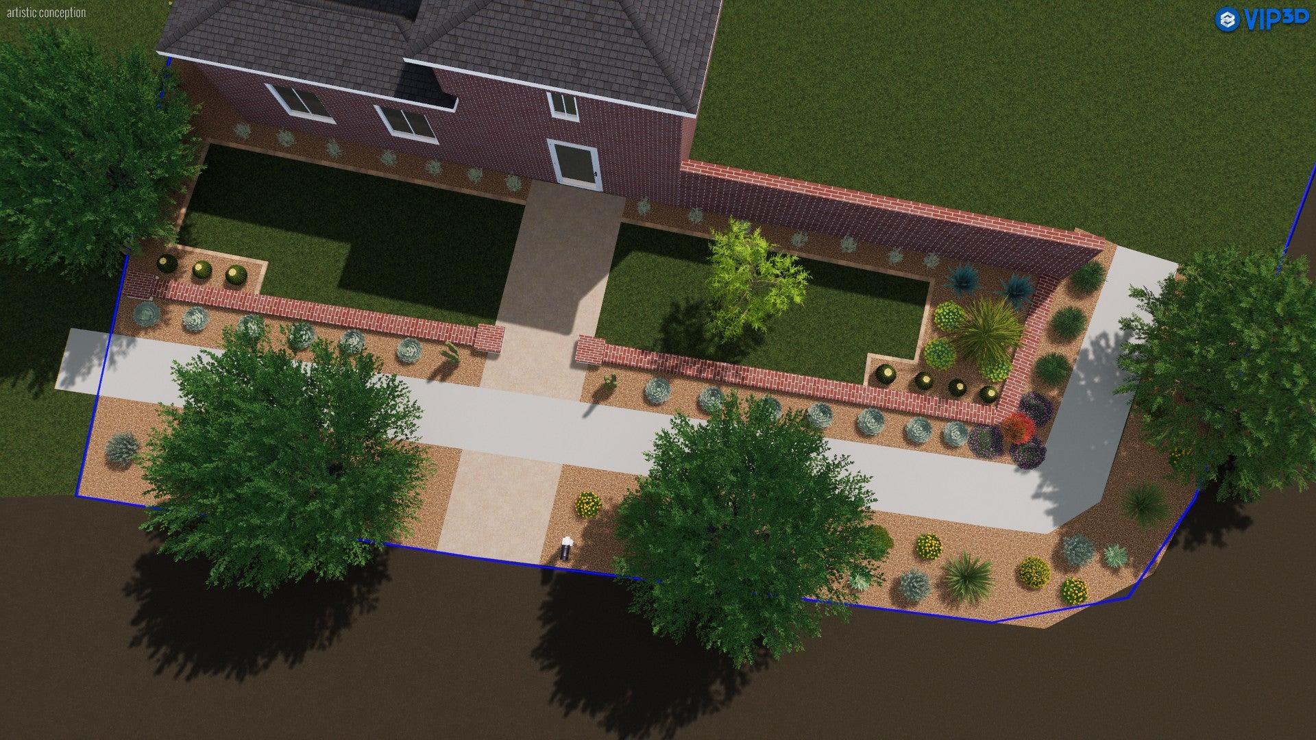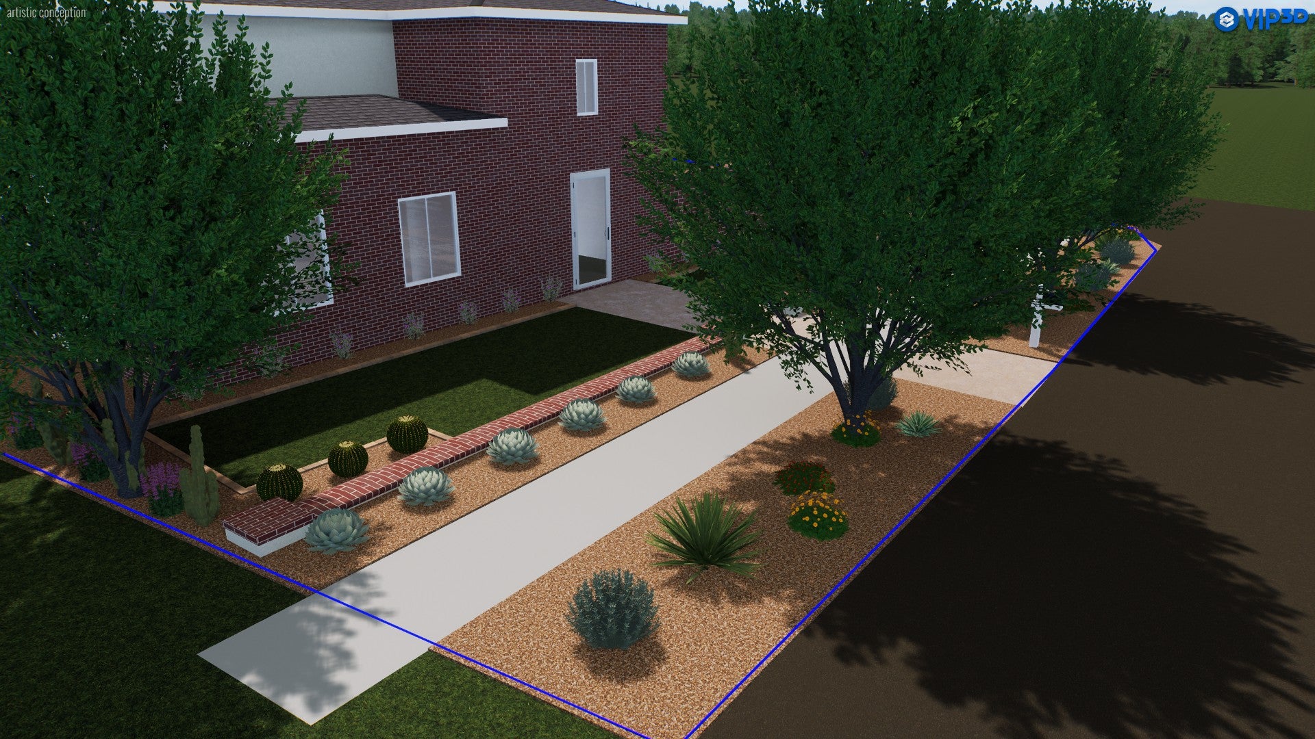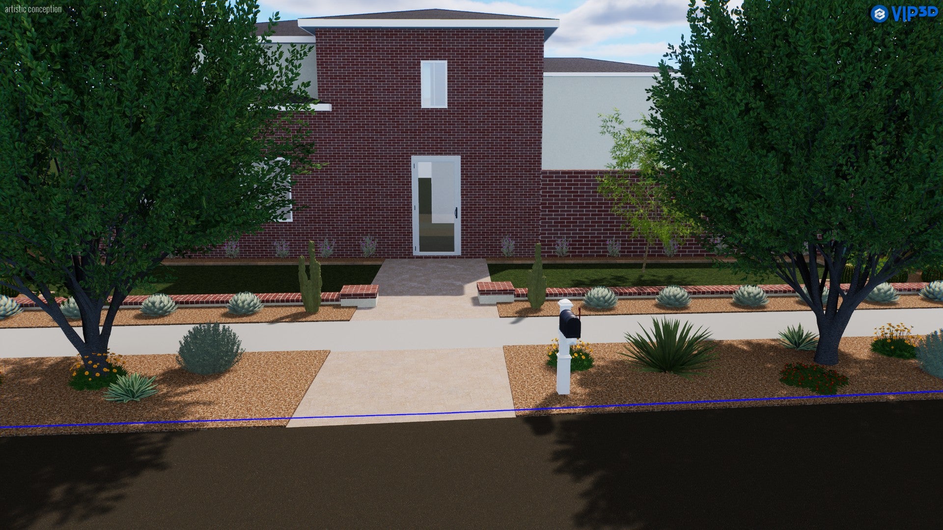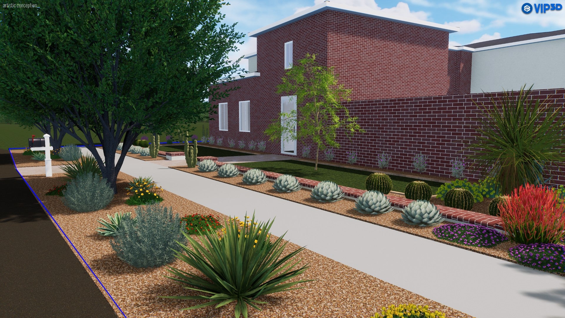 This front yard desert landscape design blends clean architectural lines with drought-tolerant Sonoran Desert planting, making it ideal for Phoenix, Scottsdale, Tempe, and surrounding Arizona Valley communities. Raised brick planters frame the home and walkway, adding structure and elevation while creating defined planting zones that are easy to maintain. A layered mix of agave, barrel cactus, yucca, desert shrubs, and flowering perennials delivers year-round texture, contrast, and seasonal color without excessive water use. Decomposed granite and decorative rock ground cover reduce weeds and improve long-term durability, while mature shade trees soften the hardscape and enhance curb appeal. Wide, clear walkways improve pedestrian flow and visibility, making this design well-suited for residential front yards, corner lots, or highly visible streetscapes. The result is a timeless, low-maintenance desert landscape that complements modern architecture and thrives in the Phoenix Valley climate.