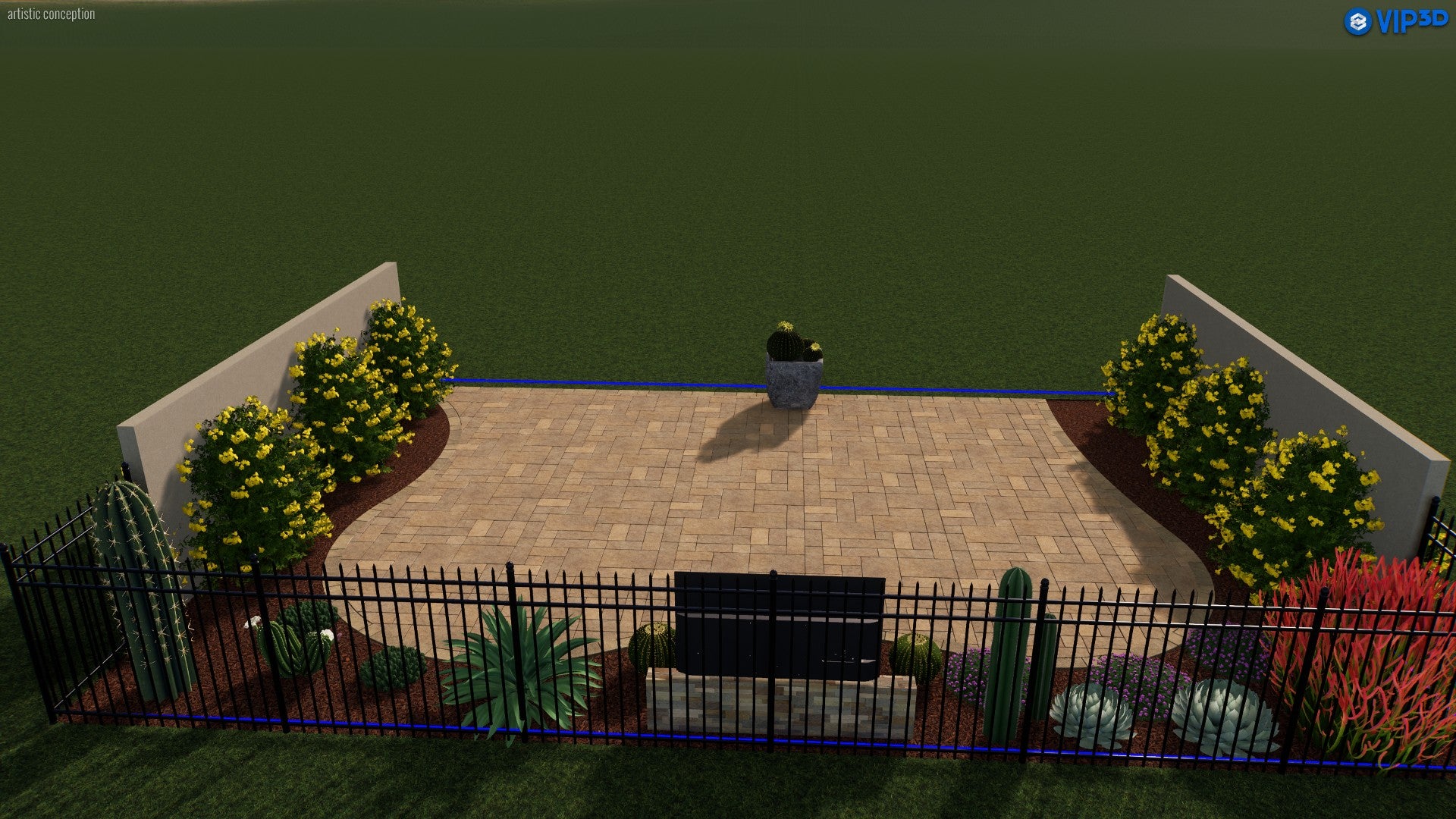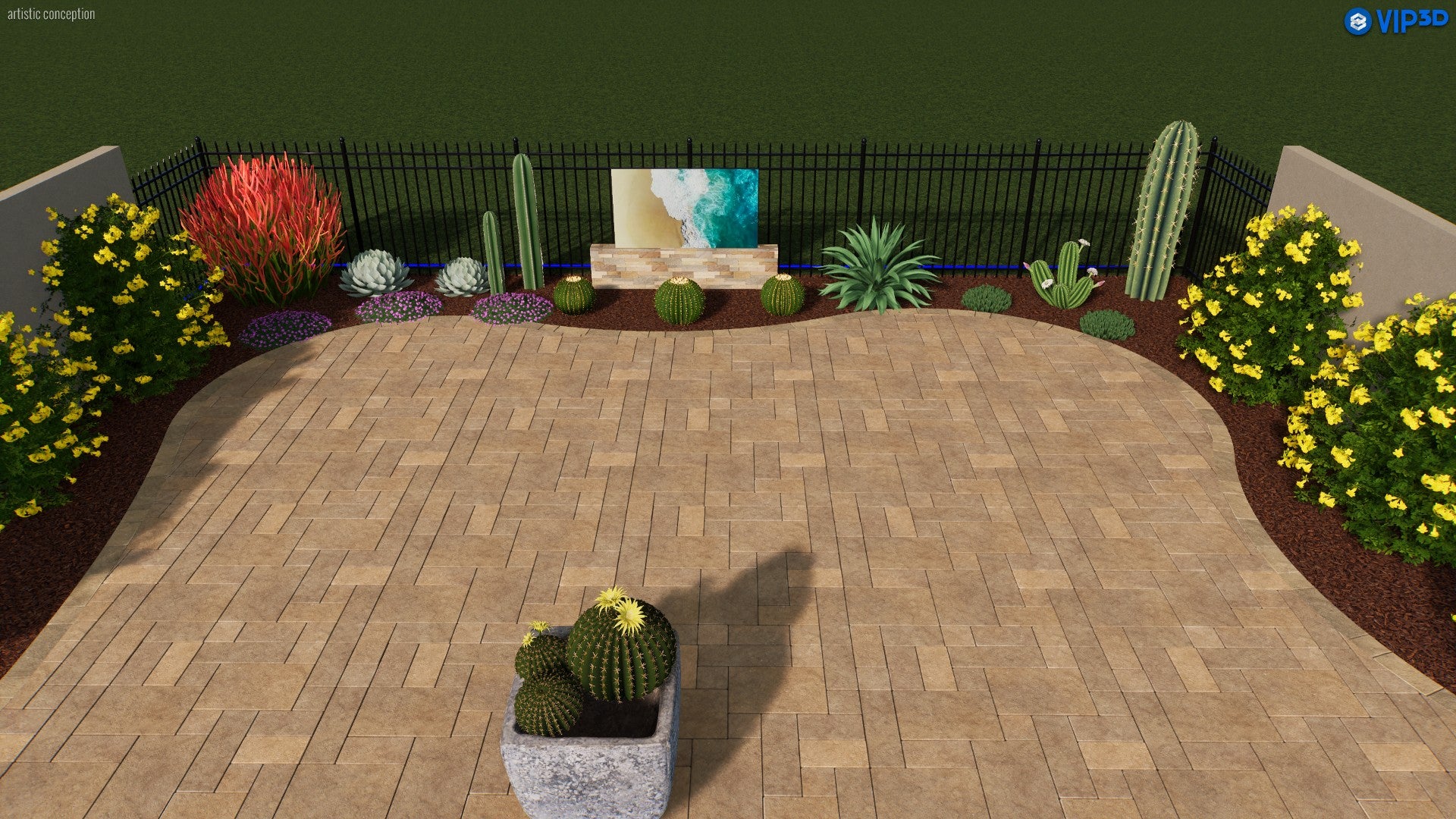 This inviting patio design embraces the signature warmth of desert living through a harmonious mix of sandy-toned pavers and bold, drought-tolerant plantings. Cacti in varying shapes and sizes stand out against vibrant flowering shrubs, creating a lively visual tapestry around the perimeter. At the center, a stone planter and art piece serve as focal points, adding a contemporary touch and tying together the colors of the surrounding landscape. The overall result is a low-maintenance, sun-drenched retreat that perfectly balances artistry and function.