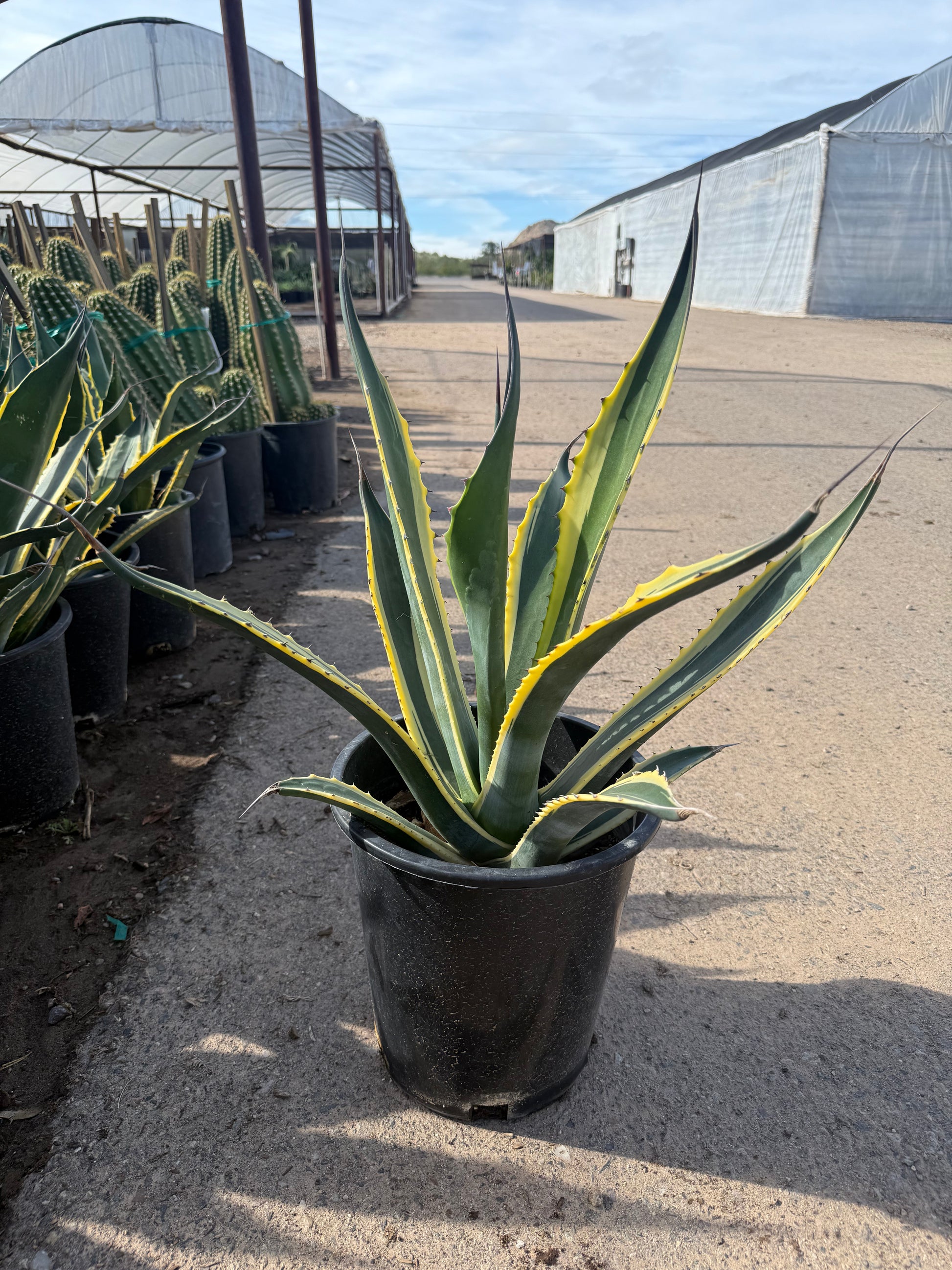 Butterfingers Agave (Agave salmiana variegated) is a stunning, large-scale agave with thick, arching leaves accented by rich golden-yellow margins. Known for its dramatic presence and brilliant color contrast, this variety brings instant impact to Arizona landscapes. Strong, sculptural, and resilient, Butterfingers thrives in full sun and heat while requiring minimal maintenance once established — the perfect balance of elegance and desert durability.