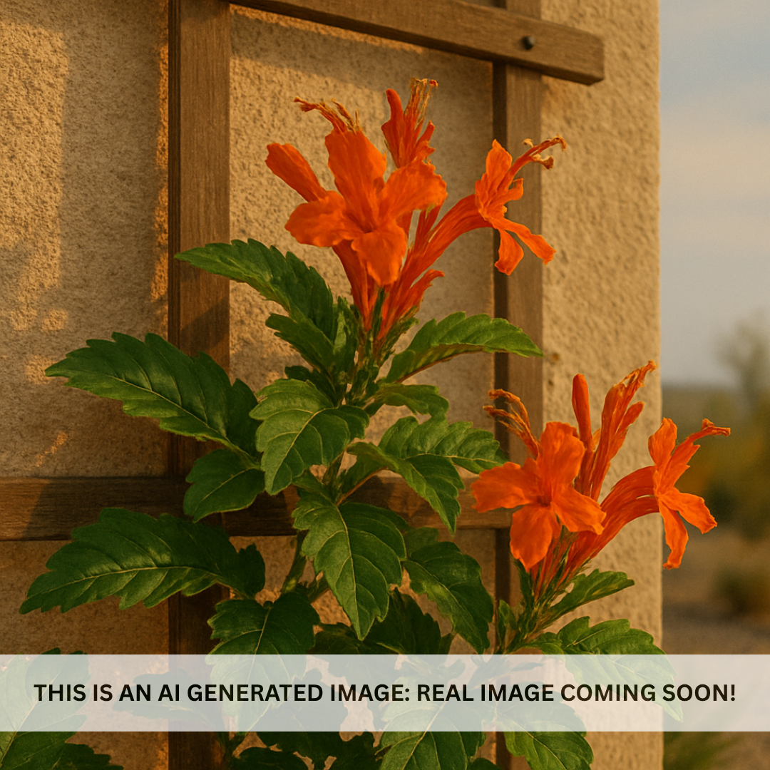The Cape Honeysuckle (Tecomaria capensis) is a vigorous, evergreen shrub/vine that produces brilliant clusters of trumpet-shaped orange flowers nearly year-round in warm climates. Trained as an espalier, it combines lush green foliage and nonstop color with a structured, space-saving design. Adapted to Arizona’s sun and heat, Cape Honeysuckle brings tropical vibrancy and pollinator appeal with very little maintenance once established.