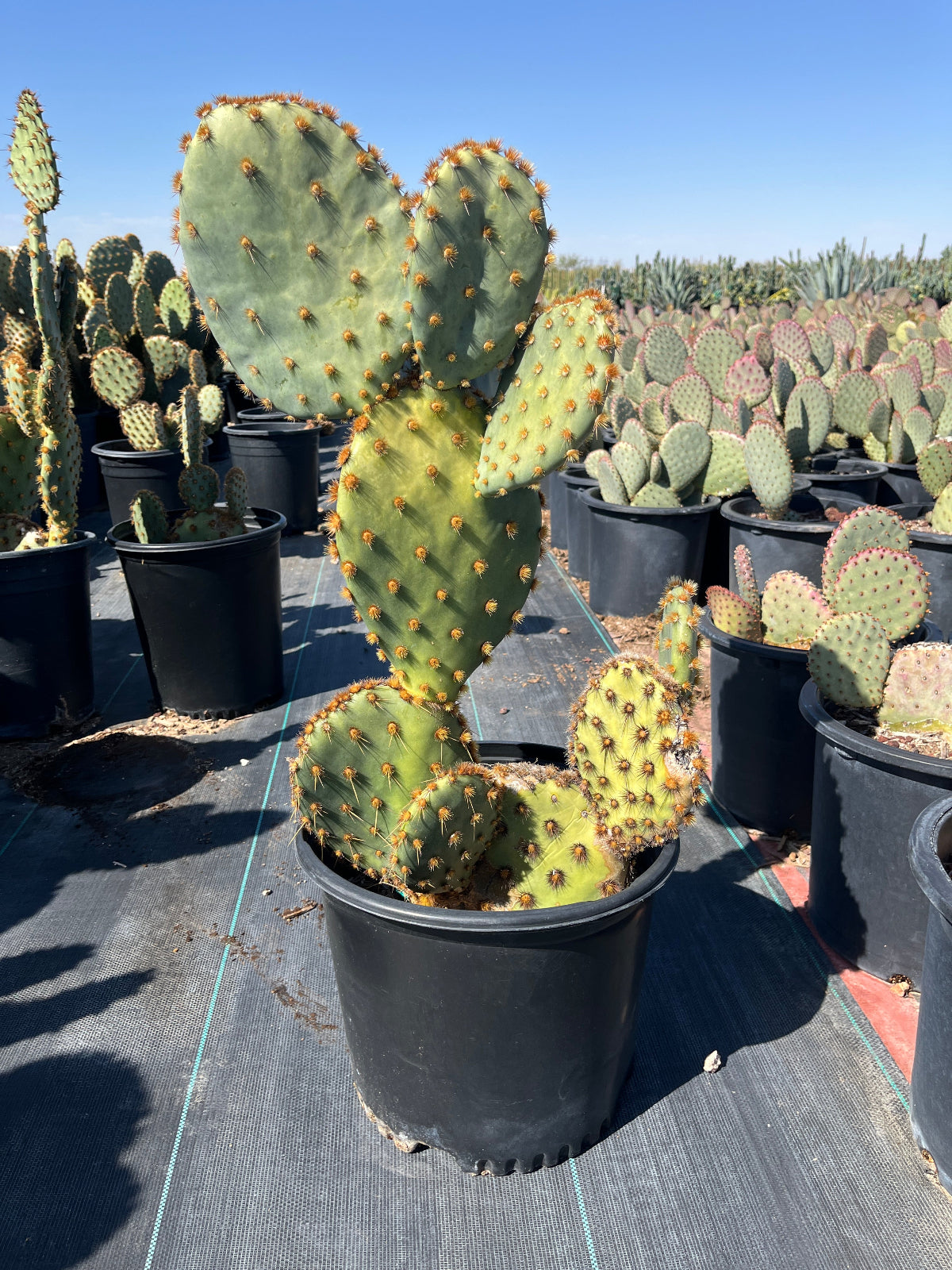 The Chenille Prickly Pear adds dramatic height, texture, and color to desert landscapes. It’s ideal for accent plantings, rock gardens, and large desert borders, where its glowing pads and fiery flowers create striking contrast against neutral gravel and stone. Use it to complement Blue Glow Agave, Desert Spoon (Dasylirion wheeleri), or Golden Barrel Cactus for a balanced palette of cool blues and warm golds. Its fast growth and spreading habit also make it excellent for erosion control on slopes or as a natural security barrier.