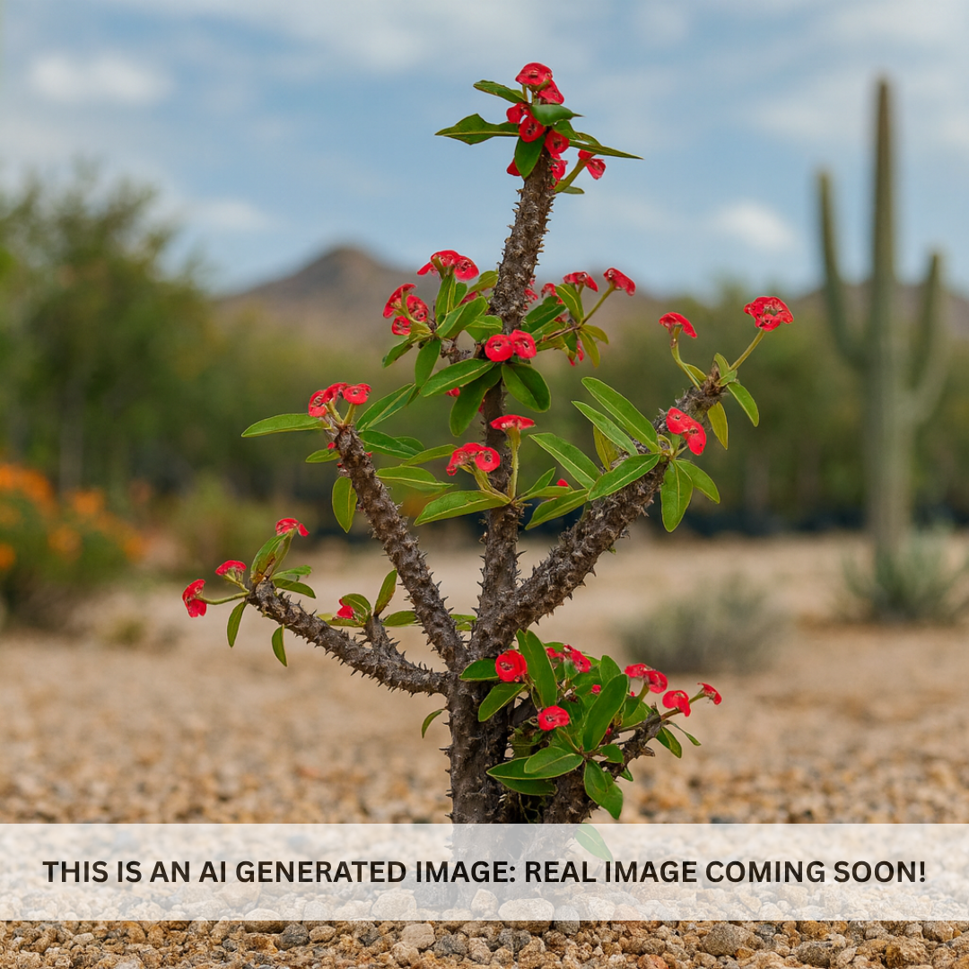 Euphorbia milii ‘Cherokee’, commonly known as Cherokee Crown of Thorns, is a vibrant, flowering succulent cherished for its year-round color and unmatched toughness in dry climates. A refined cultivar of the traditional Crown of Thorns, this variety is distinguished by its larger, velvety red bracts that encircle small golden flowers, set against deep green foliage and gracefully thorny stems. Native to Madagascar, it thrives in Arizona’s intense sun and heat, adding reliable bloom and structure to xeriscapes, entryways, and decorative containers.