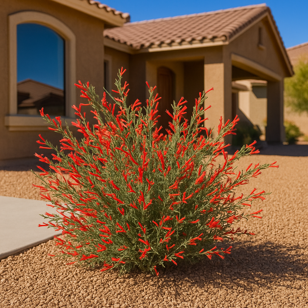 Chuparosa is a hardy, drought-tolerant desert shrub native to the southwestern United States and northern Mexico. Known for its brilliant red, tubular flowers and hummingbird appeal, it bursts into bloom from late winter through spring, adding vibrant color to low-water gardens.