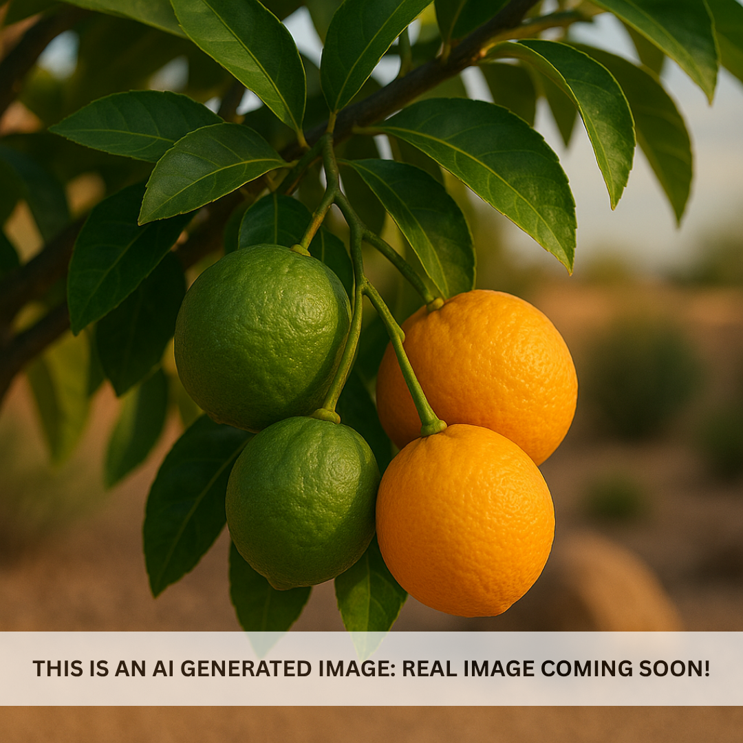 The Cocktail Citrus (Citrus ‘Cocktail’) is a specialty fruit tree prized for producing two types of fruit on one tree: sweet, juicy pummelo-grapefruit hybrids and rich, tangy mandarins. With glossy evergreen leaves, fragrant spring blossoms, and multi-season harvests, this citrus tree brings both beauty and productivity to Arizona landscapes. Its compact form, ornamental value, and unique fruit selection make it a standout choice for backyards, patios, or edible gardens.