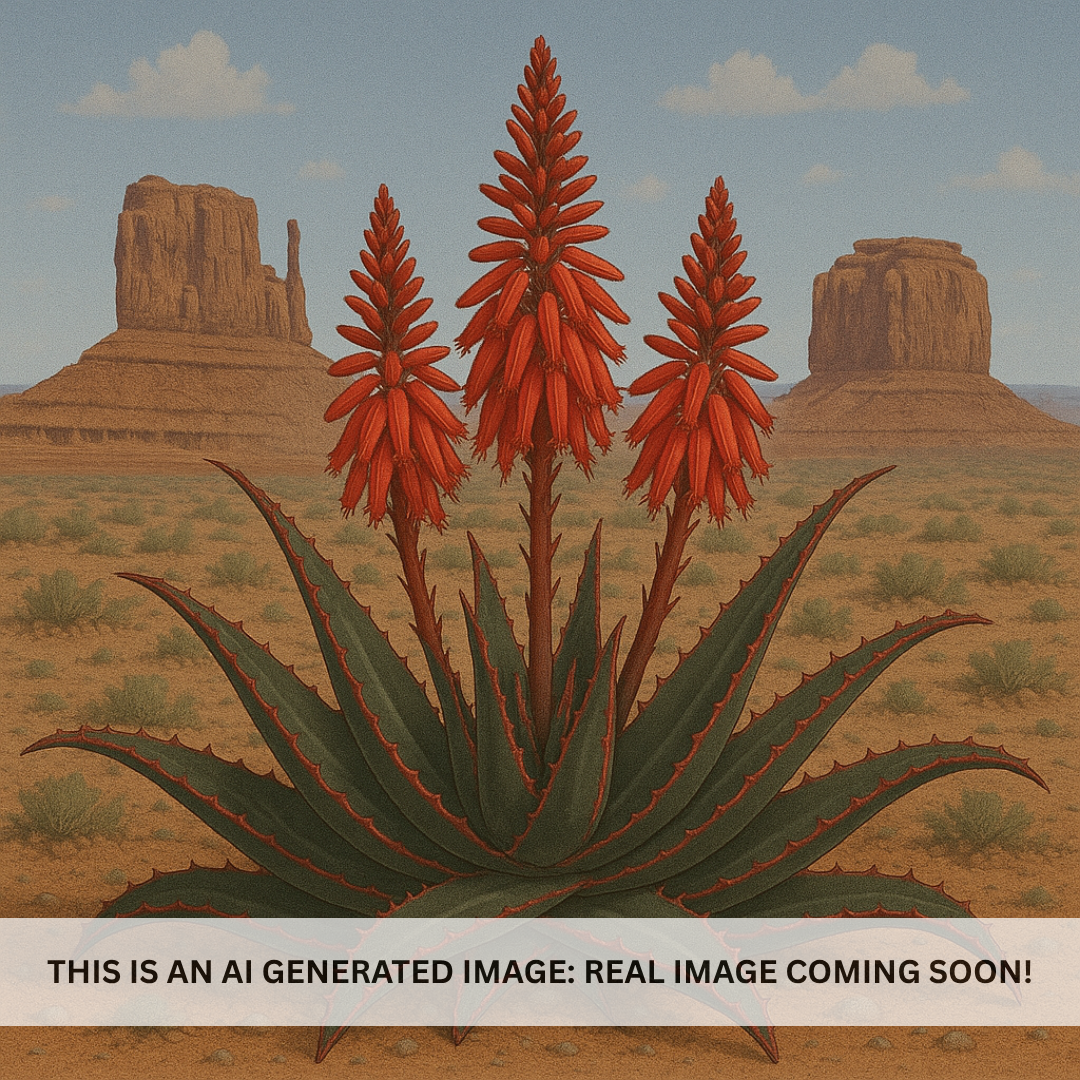 This cultivar grows 4 to 6 feet tall, forming multiple rosettes that spread 2 to 4 feet wide. The foliage is deep green with defined marginal teeth that add texture and strength. In winter, tall spikes rise above the foliage with masses of brilliant red tubular flowers that attract hummingbirds and pollinators. Its long-lasting blooms and statuesque presence make it a true showpiece plant in any landscape.