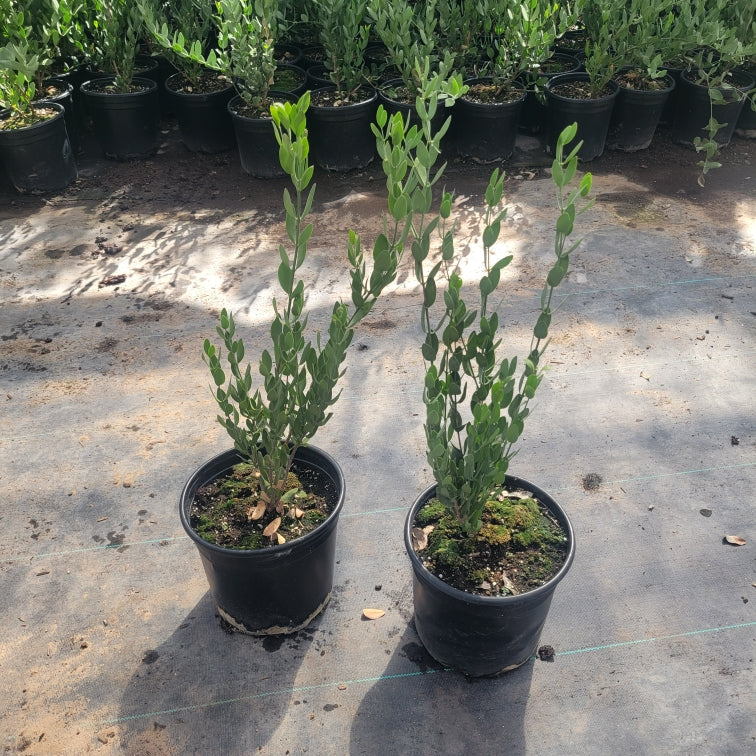 Jojoba’s thick, waxy, gray-green leaves play a crucial role in its ability to conserve water, making it extremely drought-tolerant and well-suited for harsh desert landscapes. The shrub can withstand high temperatures and low water conditions, making it a reliable choice for xeriscaping and environmentally conscious landscaping in arid regions. -