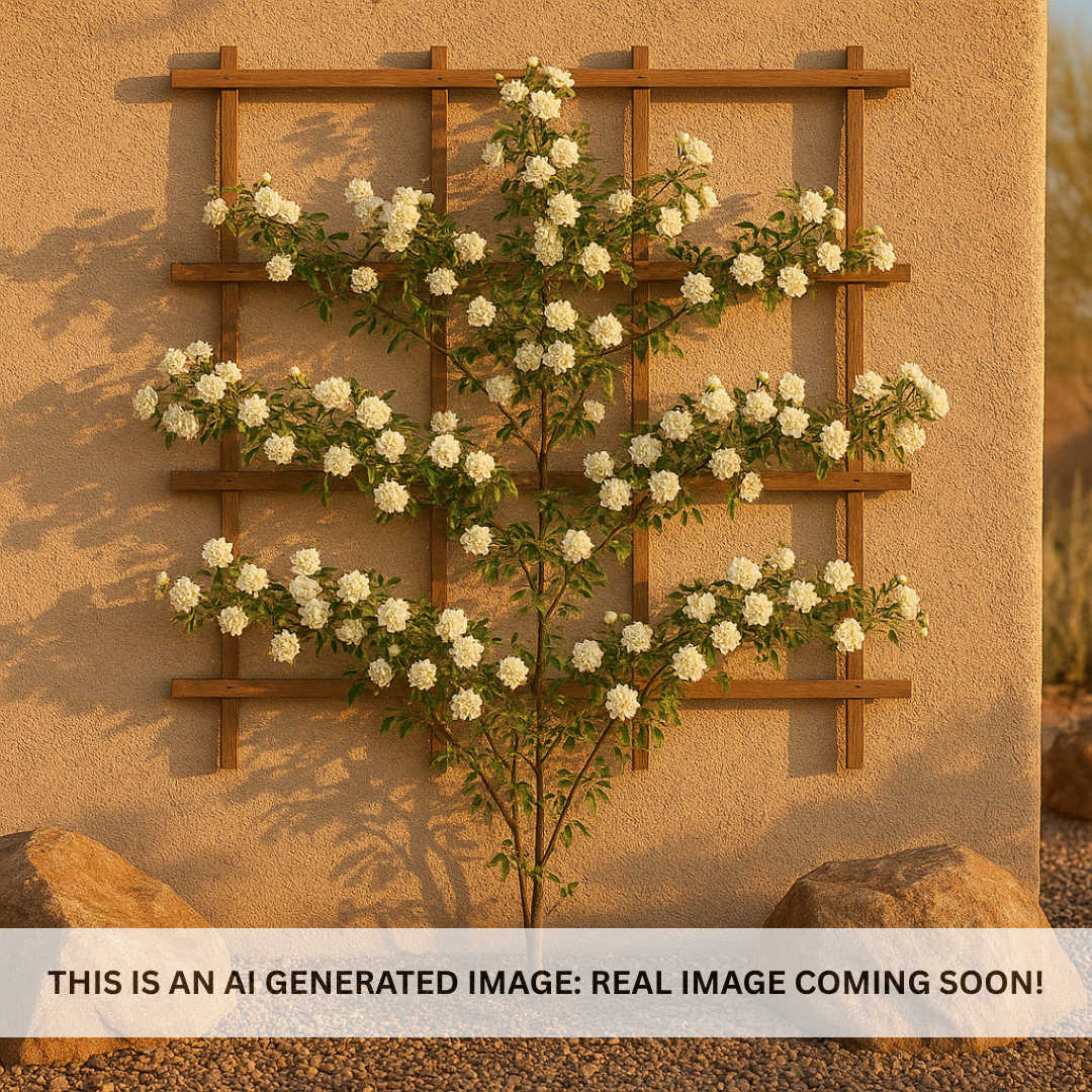 The Lady Banks Rose – White Espalier combines timeless rose charm with low-maintenance resilience. Its abundant spring flowers, thornless canes, and space-saving espalier design make it an excellent choice for Arizona homeowners seeking a graceful, long-lived climber for vertical interest.