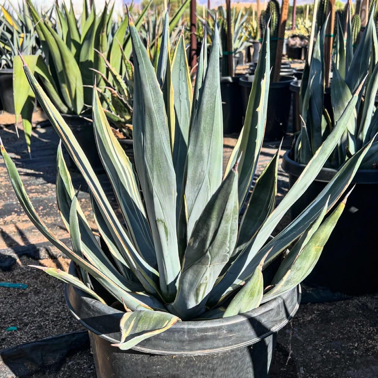 The Agave americana ‘Little Miss America’ CCF is a compact, variegated beauty that brings dramatic color and structure to desert landscapes. A refined selection from Civano Cactus Farm, this smaller-growing agave offers a perfect balance of toughness and ornamental appeal. Its symmetrical rosette of blue-green leaves edged in creamy yellow creates bold contrast against gravel and stone, making it a showpiece in any Arizona landscape.