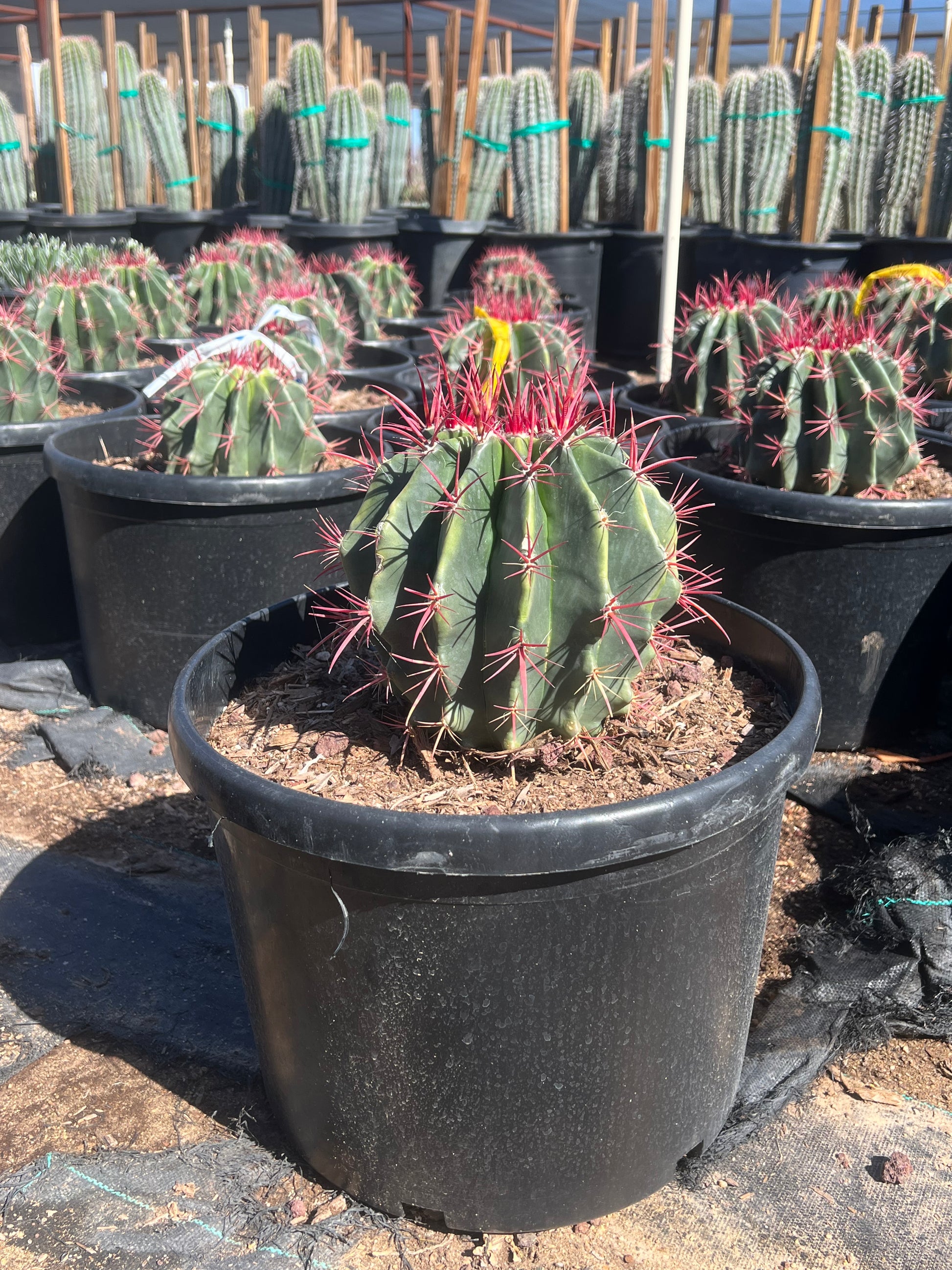 The Mexican Fire Barrel, scientifically known as Ferocactus pilosus (also referred to as Ferocactus stainesii), is a stunning and distinctive barrel cactus native to the desert regions of northern and central Mexico. It is well-known for its cylindrical shape, vibrant red spines, and fiery-colored flowers, making it a standout feature in any landscape.