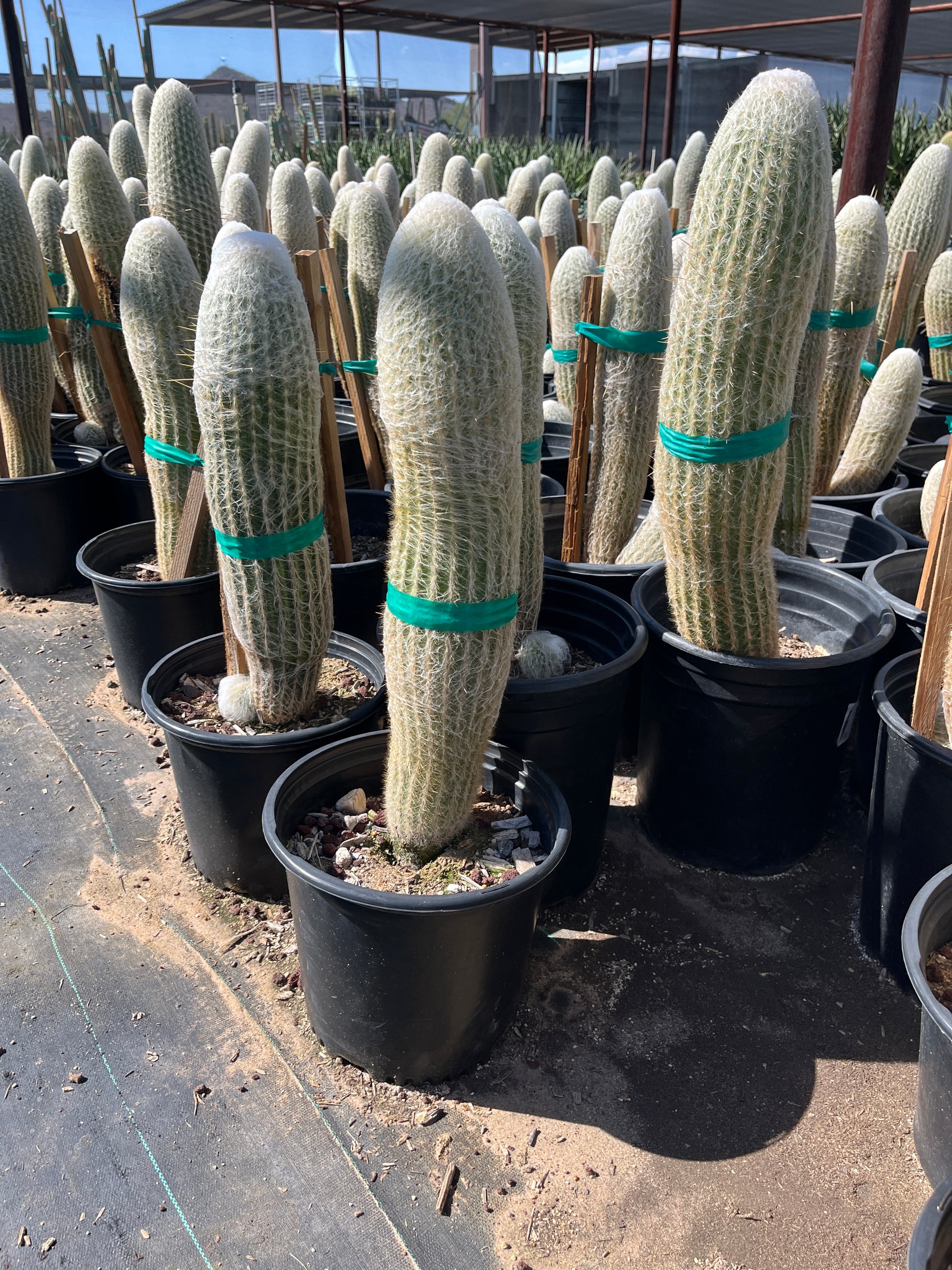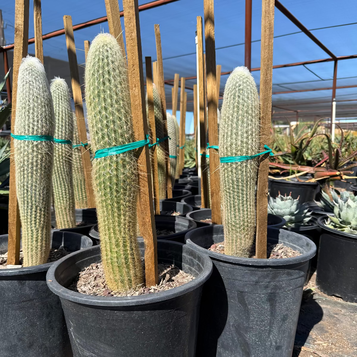 Espostoa melanostele adds refined elegance and brightness to desert, modern, or Mediterranean landscapes. Its columnar form and soft, silvery coating provide contrast to darker, sharper plants such as Golden Barrel, Agave parryi, or Desert Spoon.