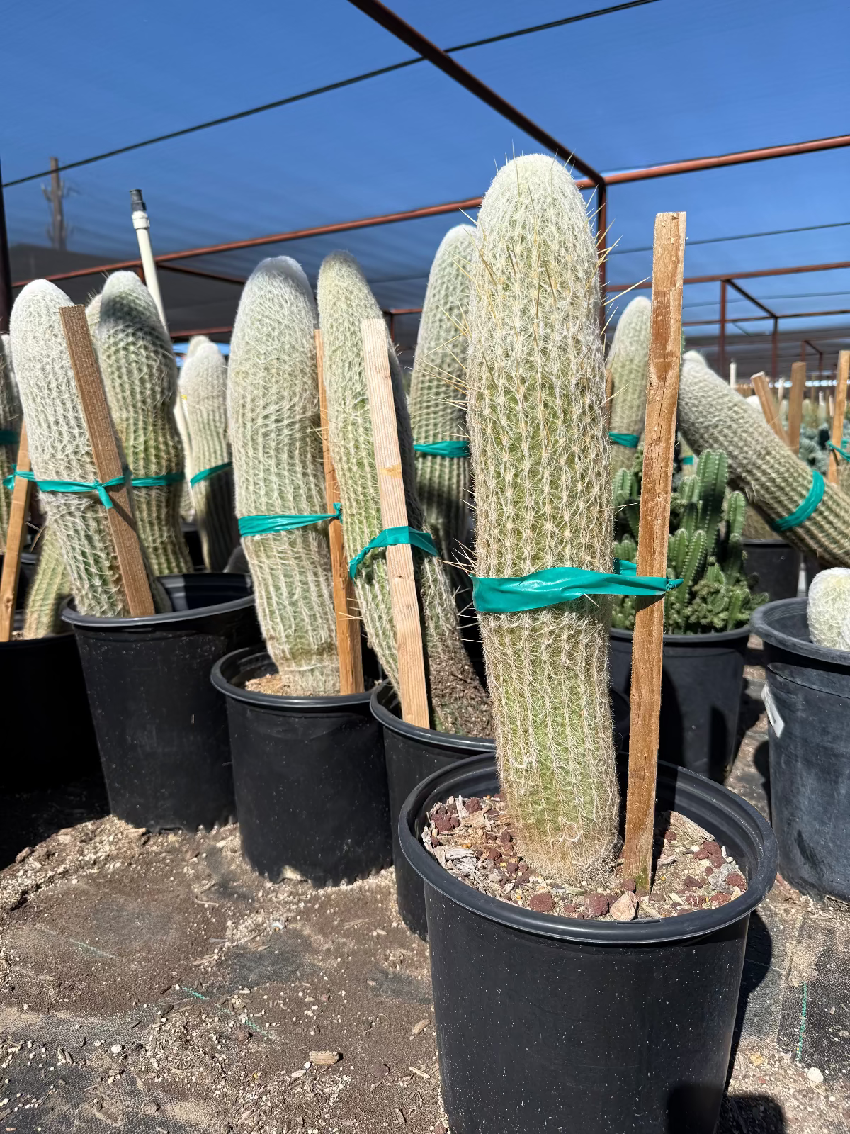 The Peruvian Old Woman Cactus (Espostoa melanostele) is a graceful, columnar cactus native to the Andes Mountains of southern Ecuador and northern Peru. It is best known for its dense, silvery-white wool covering that gives it a soft, fuzzy appearance—earning it the affectionate nickname “Old Woman.” Despite its gentle look, this species is tough, drought-tolerant, and perfectly suited for Arizona’s dry, sunny climate.