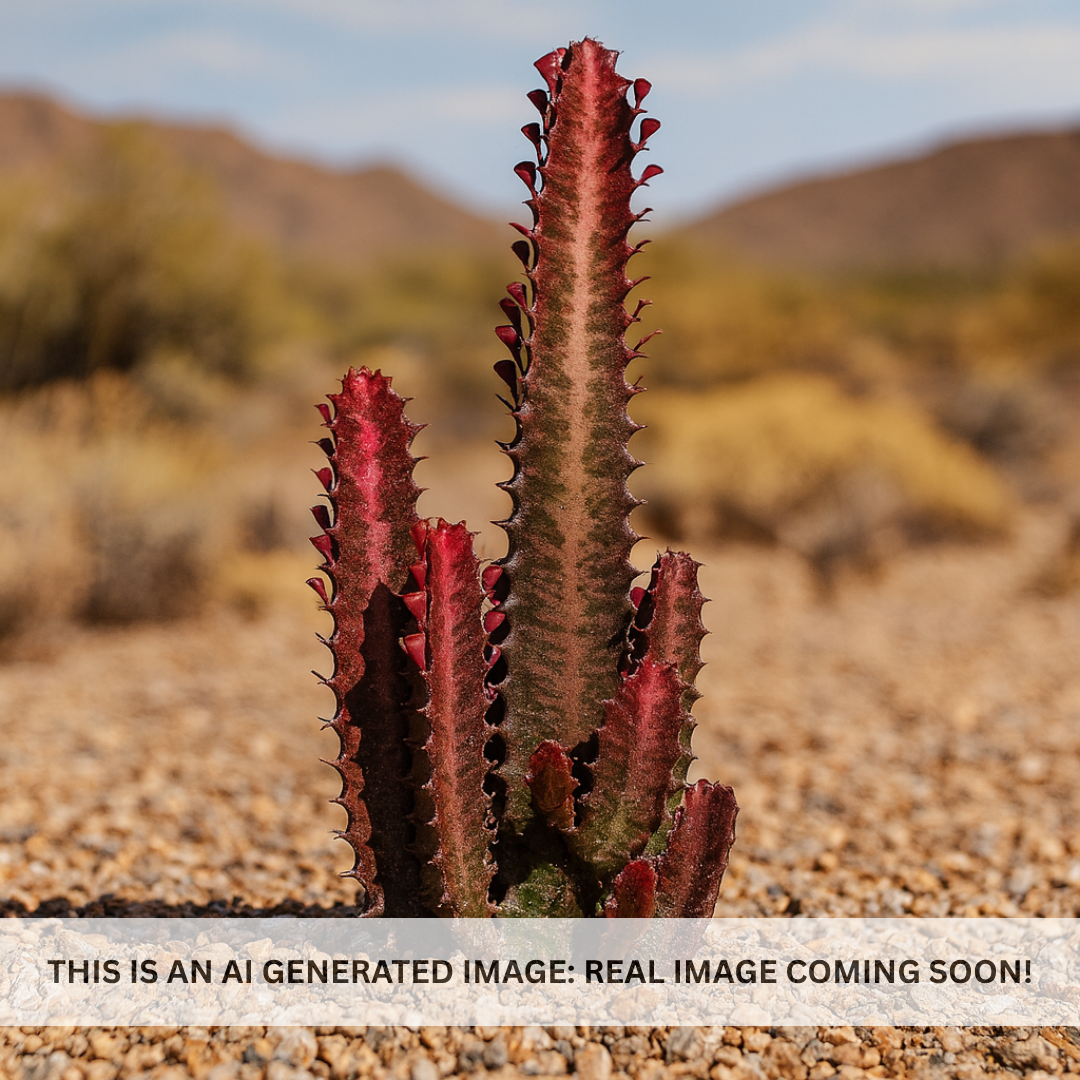 Euphorbia trigona ‘Red’, commonly known as Ruby Red African Milk Tree, is a stunning, upright succulent prized for its vibrant red-to-burgundy stems and bold, geometric structure. A colorful cultivar of Euphorbia trigona, this plant offers all the drought tolerance and resilience of its green counterpart while adding a dramatic pop of color that intensifies in bright desert light. Native to Central Africa, Ruby Red thrives in the intense sun and arid conditions of Arizona, making it a perfect choice for homeowners seeking architectural beauty with vivid color and minimal water requirements.