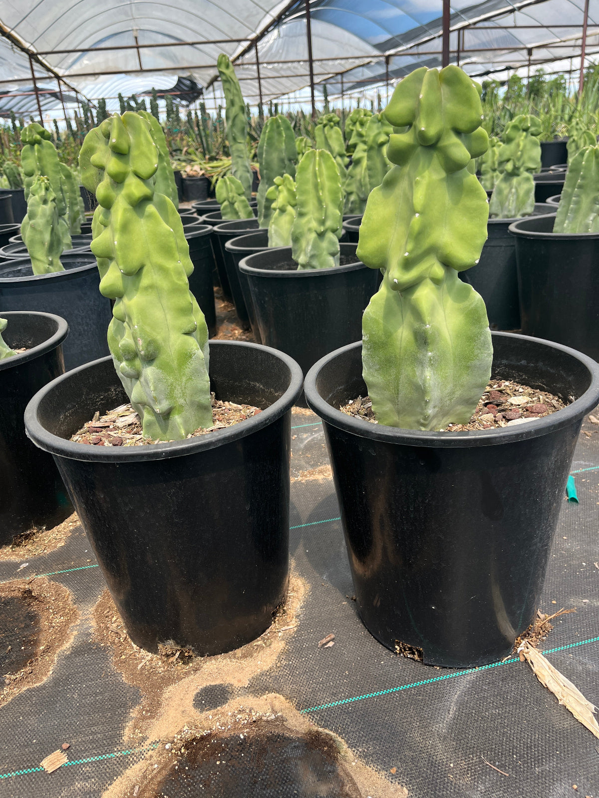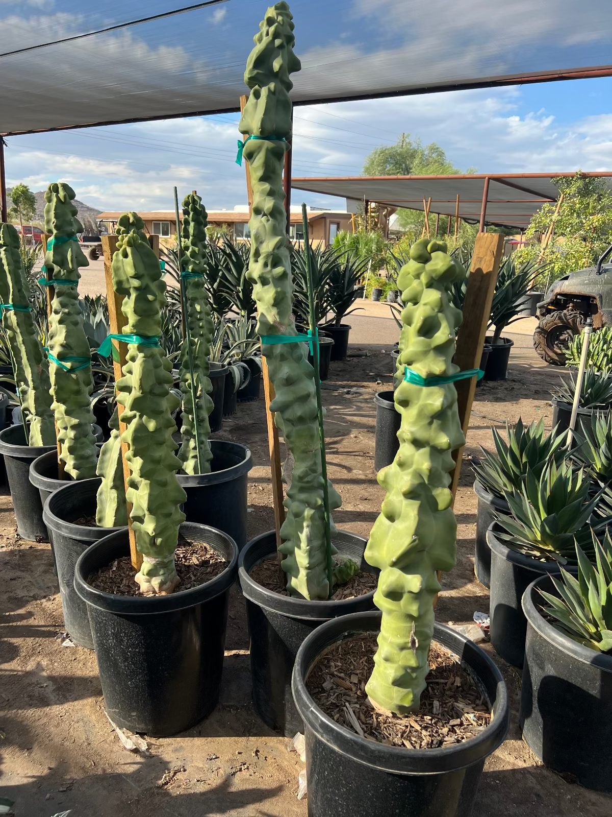 The Totem Pole Major is the definition of living desert sculpture. Its smooth, surreal form makes it a centerpiece in modern, minimalist, and architectural landscapes. It’s ideal for use near boulders, along pathways, or as a vertical accent in rock gardens and desert courtyards. Its gray-green color complements silver-blue agaves, golden barrels, and red-blooming aloes. In large containers, it creates a powerful design element for patios or entryways. Whether standing alone or in a small cluster, this cactus delivers unmatched visual impact with virtually no maintenance.