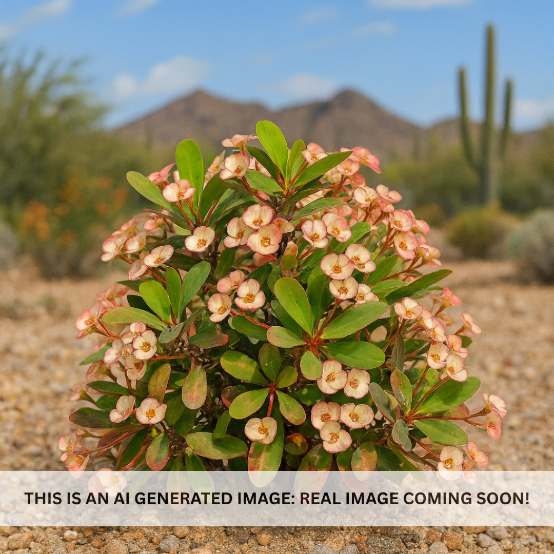 Euphorbia milii ‘Tropical Fiesta’, commonly known as Tropical Fiesta Crown of Thorns, is one of the most colorful and decorative varieties of Euphorbia milii, celebrated for its stunning two-toned blooms and year-round flowering habit. With bracts that blend golden yellow and coral-pink hues, it adds a tropical burst of color to Arizona’s desert landscapes while maintaining the toughness and drought tolerance that make the Crown of Thorns family so reliable. Native to Madagascar, this resilient succulent shrub thrives in heat, sun, and dry soil—making it an exceptional choice for homeowners seeking a splash of continuous color with minimal upkeep.