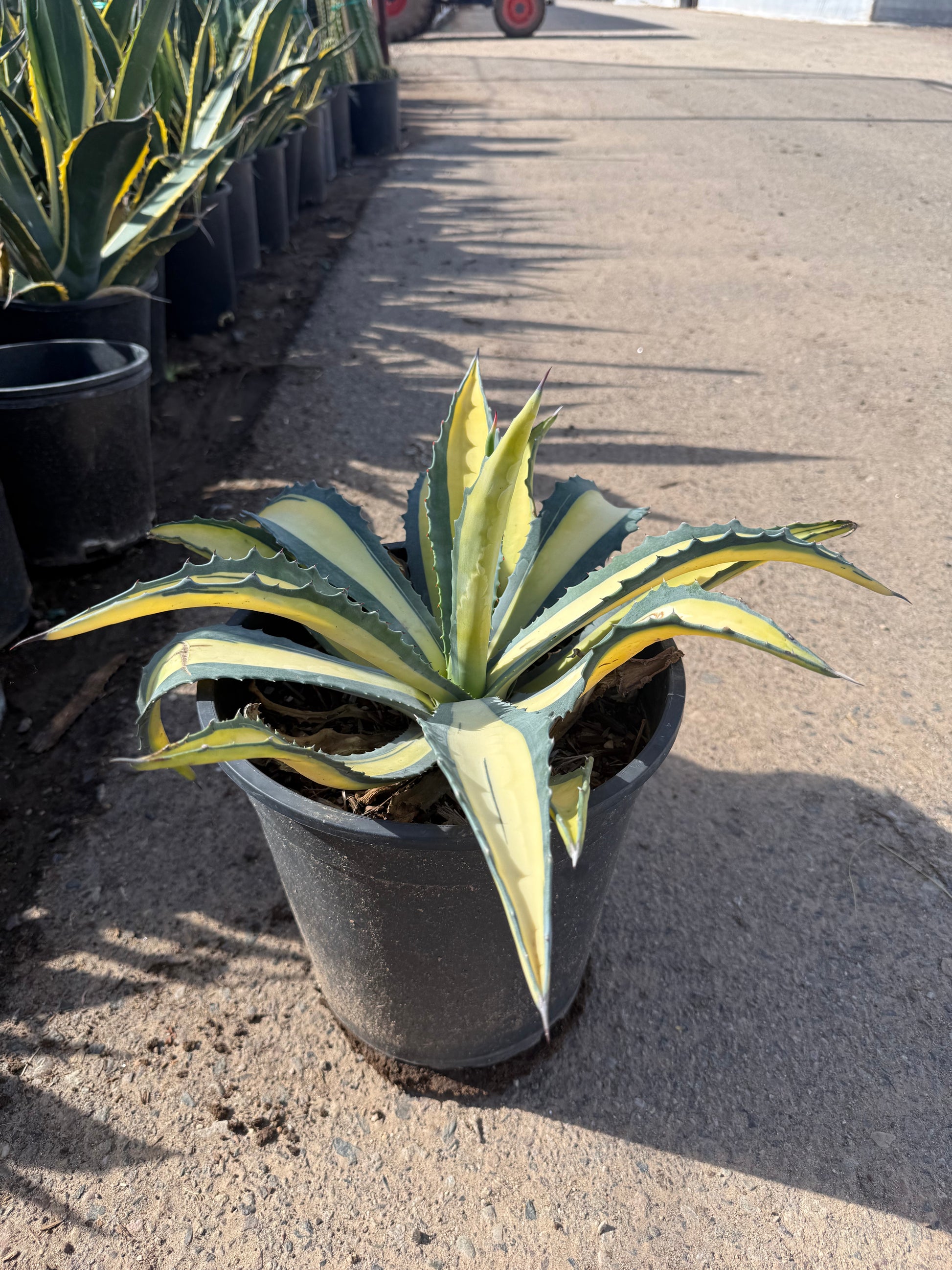The Yellow Striped Century Plant (Agave americana ‘Mediopicta Aurea’) is a stunning variegated agave known for its dramatic golden-yellow stripes running along the center of each leaf. With its vivid coloring and architectural symmetry, this agave adds instant visual impact to Arizona landscapes. Tough, heat-loving, and low maintenance, it’s one of the most eye-catching accent plants for modern desert and xeriscape designs.